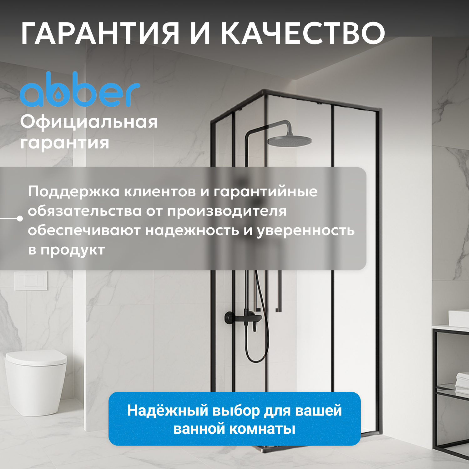 ABBER — российский бренд, сочетающий современные технологии с эстетикой и стандартами немецкого качества, все изделия проходят строгий контроль. На душевой уголок Schwarzer Diamant AG02100BH предоставляется трехлетняя гарантия. Вес конструкции составляет 62 кг.