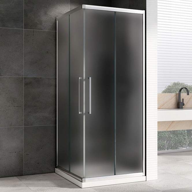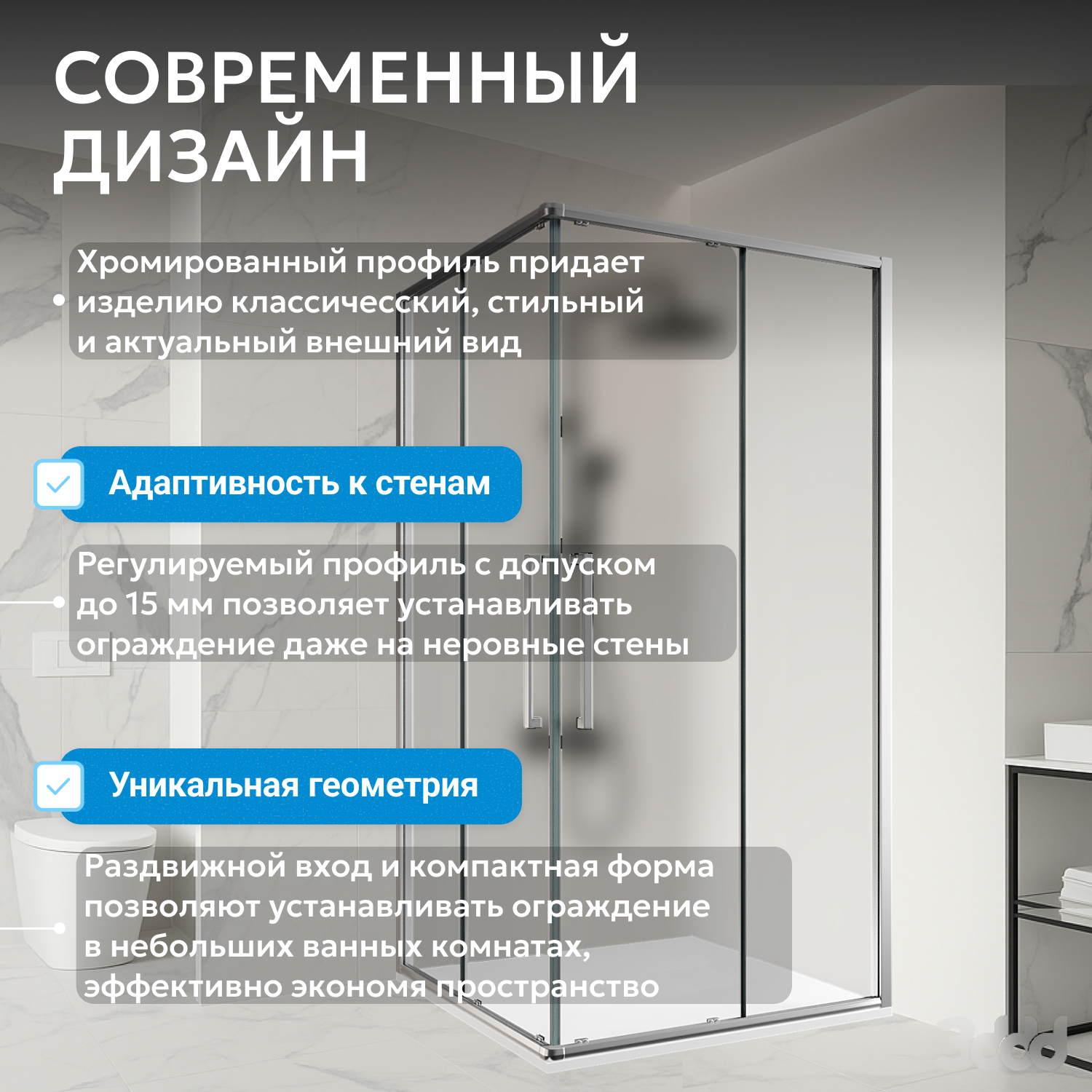 Металлические хромированные профили устойчивы к коррозии и механическим нагрузкам. Раздвижные двери на двойных роликах облегчают эксплуатацию и увеличивают срок службы конструкции. Душевой уголок поставляется без поддона, что позволяет выбрать высоту и материал на свой вкус.