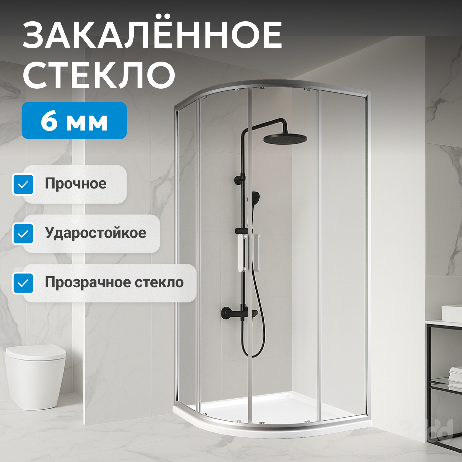 Прозрачное закаленное стекло толщиной 6 мм обеспечивает прочность и безопасность. Раздвижная система двух дверей на двойных роликах гарантирует плавное и надежное открывание, металлические ручки устойчивы к износу. Размер — 100×100 см, высота — 195 см, что подходит для большинства стандартных ванных комнат.