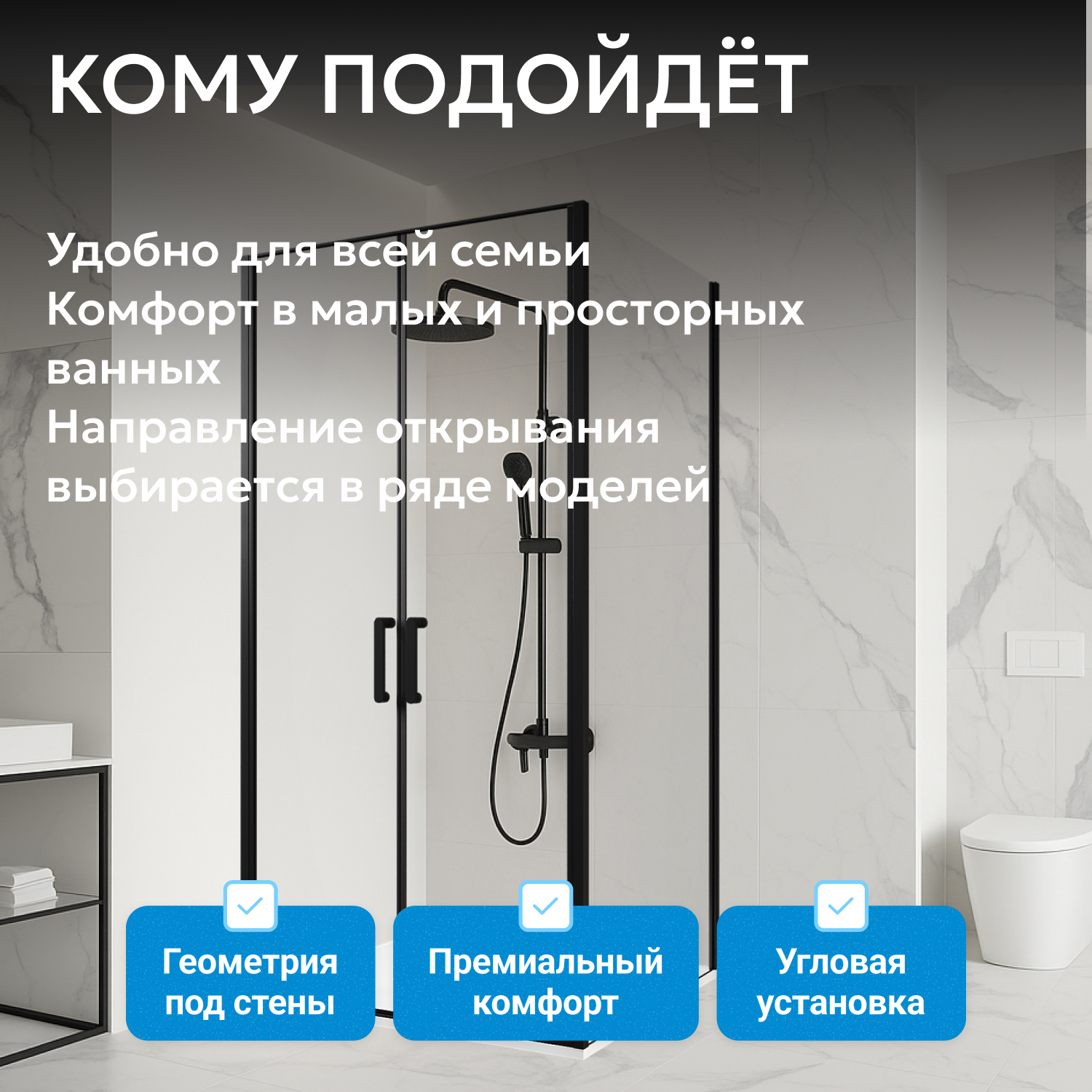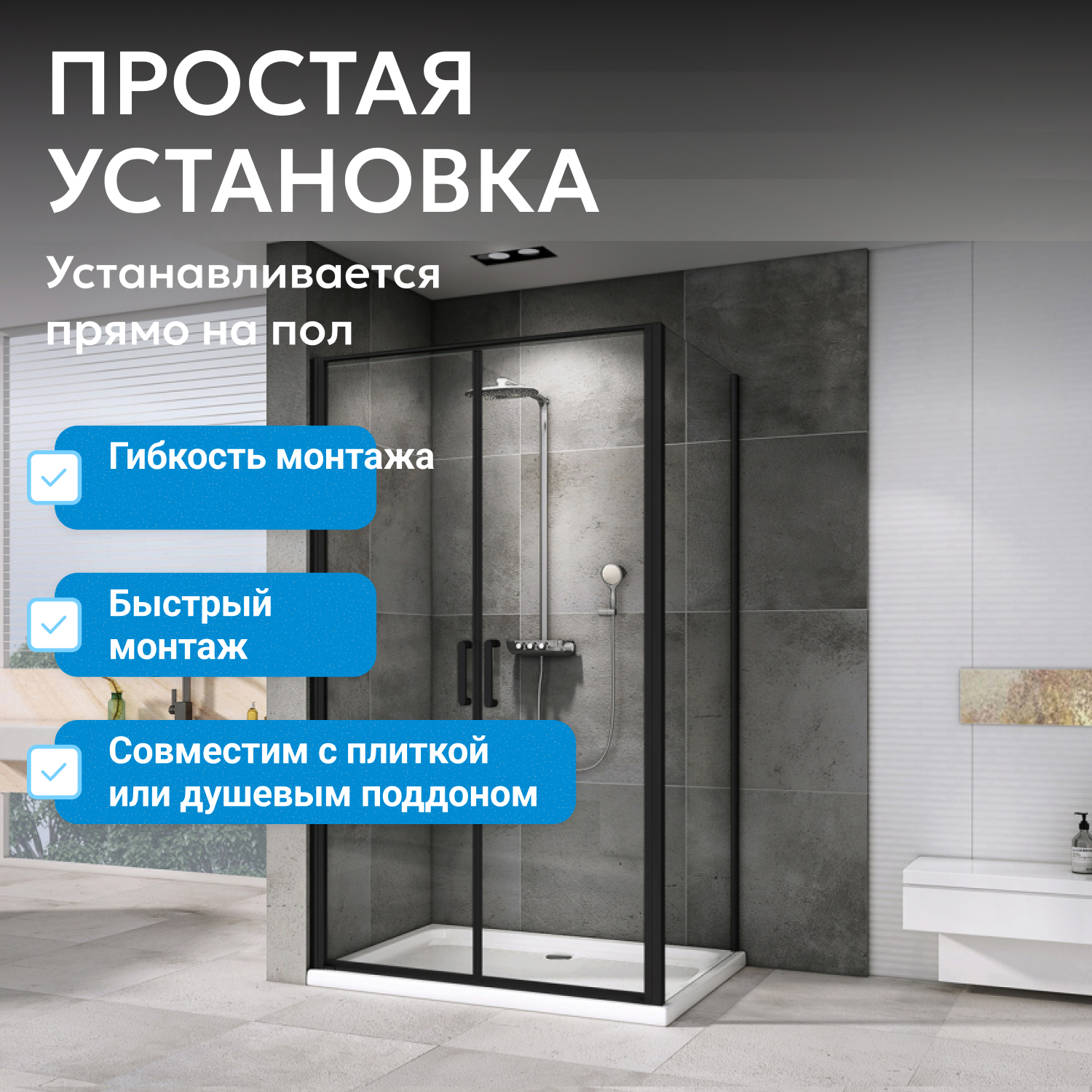 Устанавливается в угол помещения с использованием низкого поддона (не входит в комплект). Прозрачные стеклянные полотна толщиной 6 мм сочетаются с черным профилем и металлическими ручками. Квадратная форма и универсальная модификация подходят для разных интерьеров ванных комнат. Две распашные двери с шириной входа 881 мм обеспечивают удобный доступ.