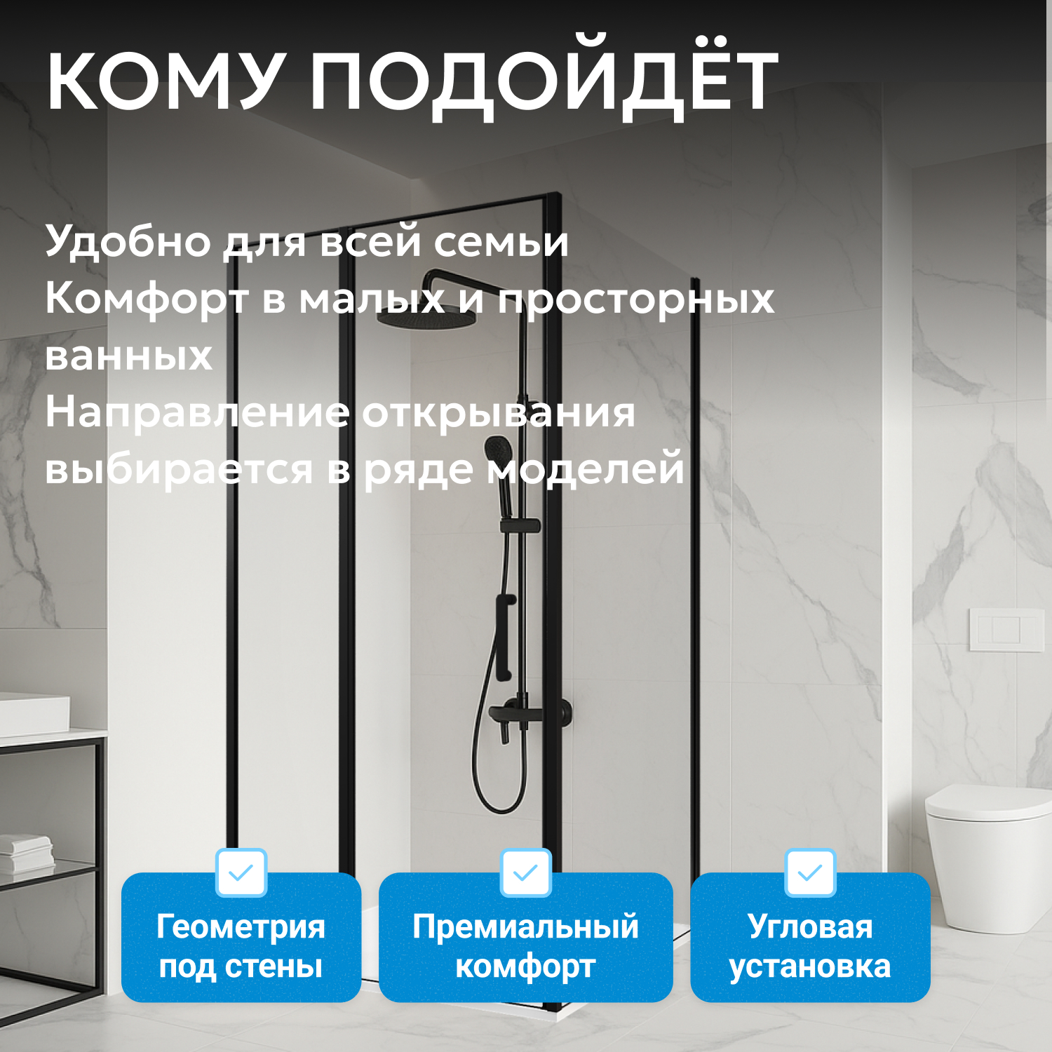 Модель квадратной формы, размером 100×100 см, высотой 195 см, оснащена одной распашной дверью с металлической ручкой. Используется 6-миллиметровое прозрачное закалённое стекло без водоотталкивающего покрытия. Профиль окрашен в чёрный цвет. Поддон приобретается отдельно, что даёт возможность выбора поддона по индивидуальным требованиям.