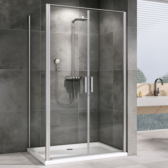 Коллекция Sonnenstrand отличается универсальностью: уголок совместим с разными поддонами и вариантами монтажа в углу. Ширина входа 881 мм обеспечивает легкость доступа. В комплекте предусмотрены прочные металлические ручки. Поддон приобретается отдельно, что дает возможность индивидуального выбора под ваш проект.