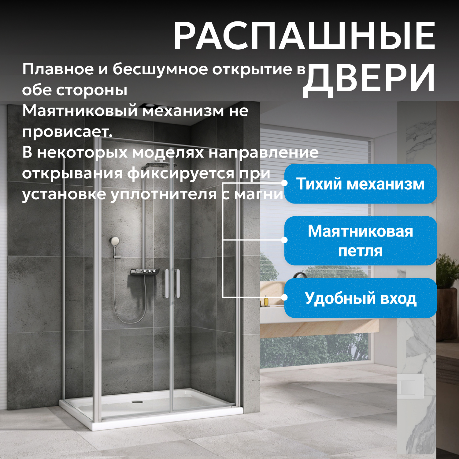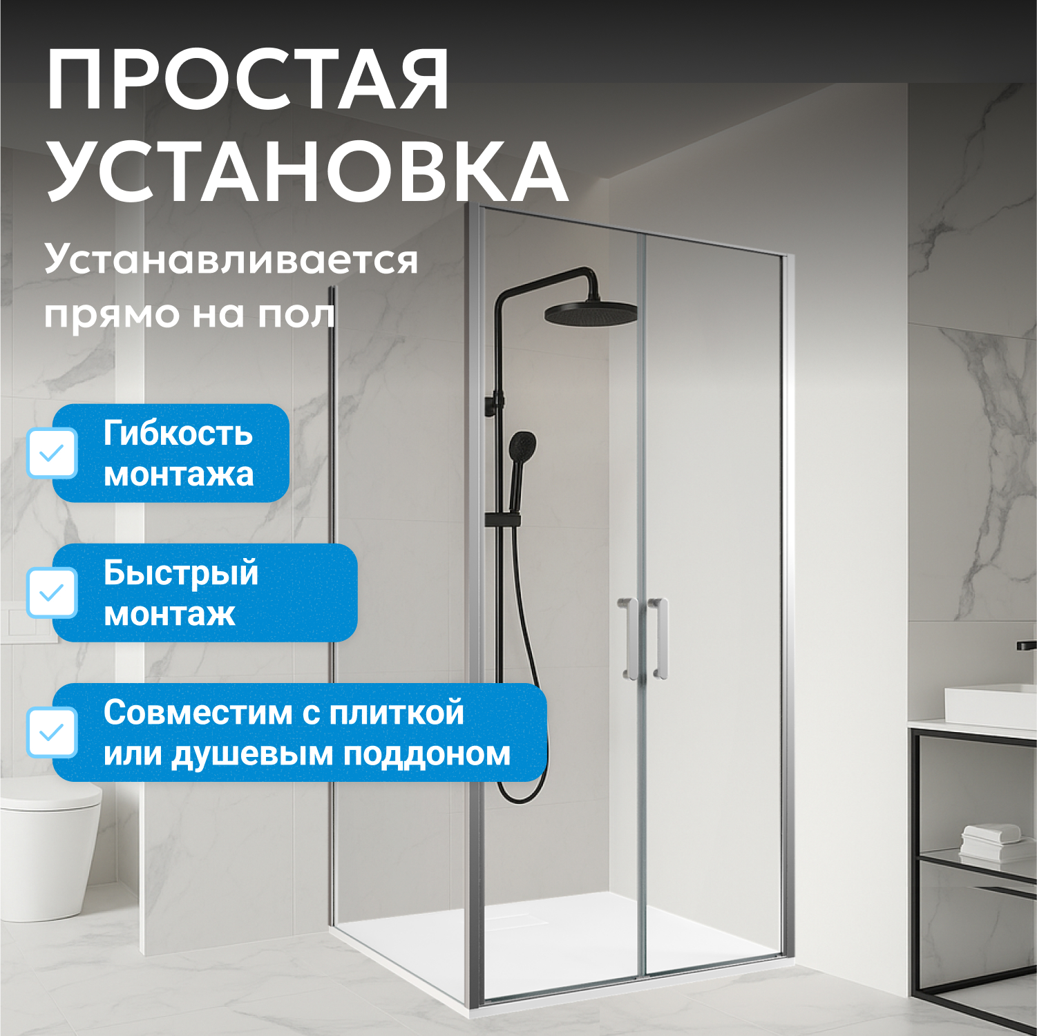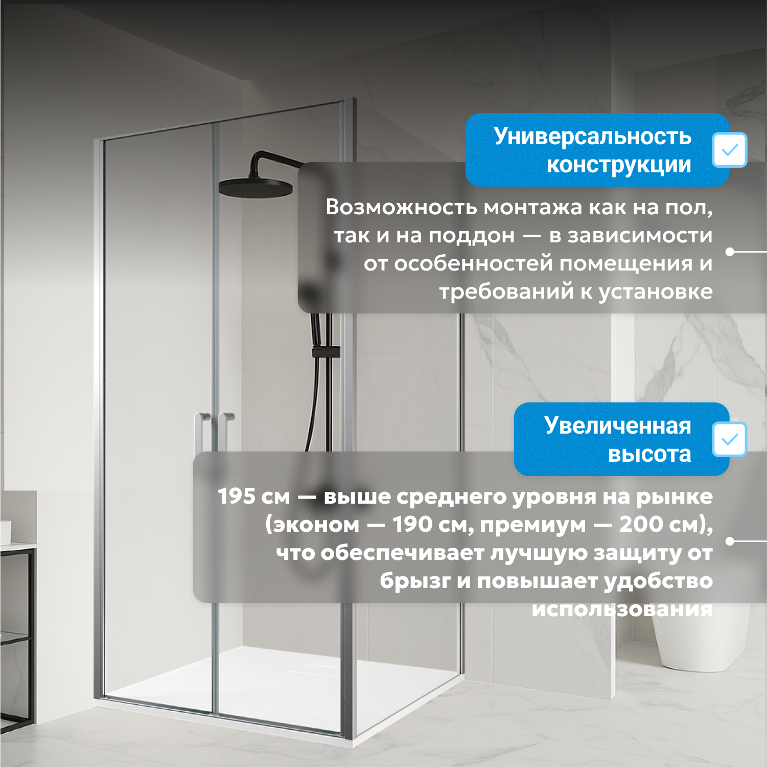 Монтаж ABBER AG04100C-S100 занимает минимальное время благодаря продуманной системе креплений и необходимым элементам для надежной установки. В комплекте отсутствуют доводчики и водоотталкивающее покрытие, что упрощает уход за изделием. Высота ограждения — 1950 мм, подходит для стандартных и высоких помещений.