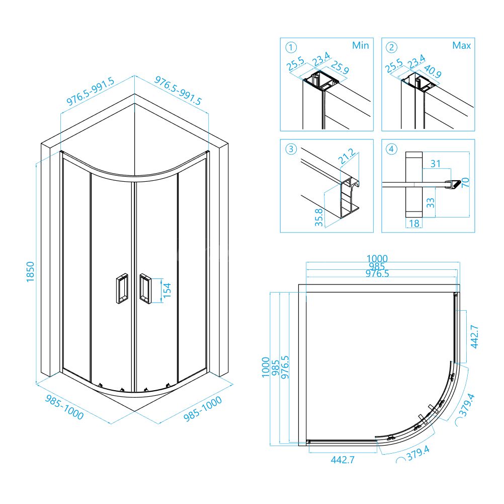 Стекло имеет покрытие анти капля Easy Clean, которое облегчает уход за душевым уголком и предотвращает появление пятен от воды и мыльной пены. Регулируемый профиль обеспечивает возможность регулировки размера уголка для того, чтобы он подходил для разных размеров ванных комнат.