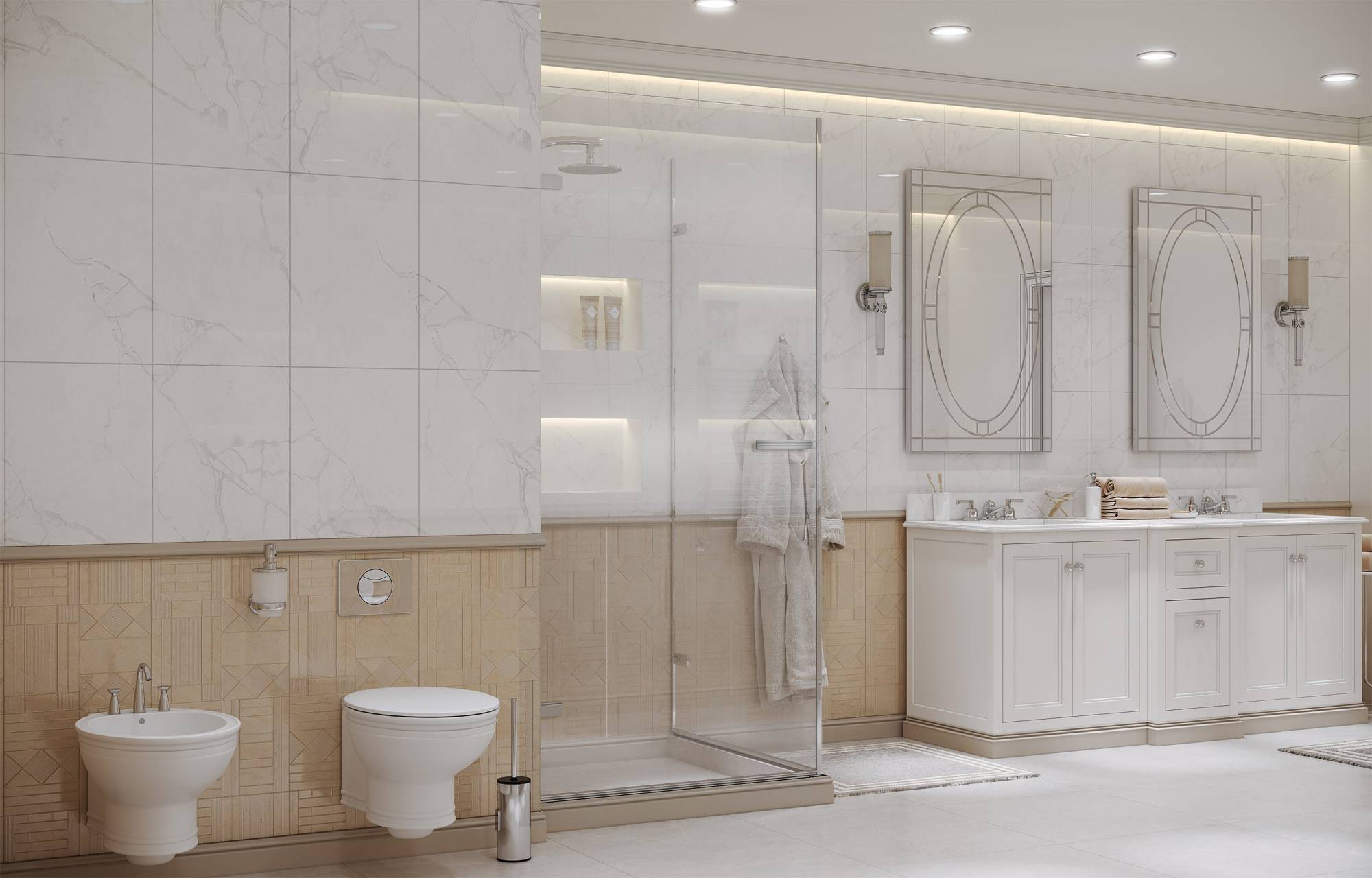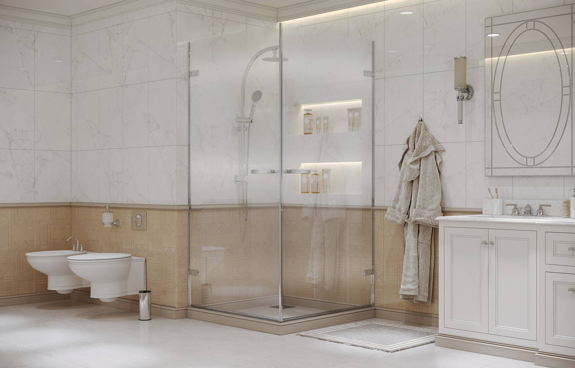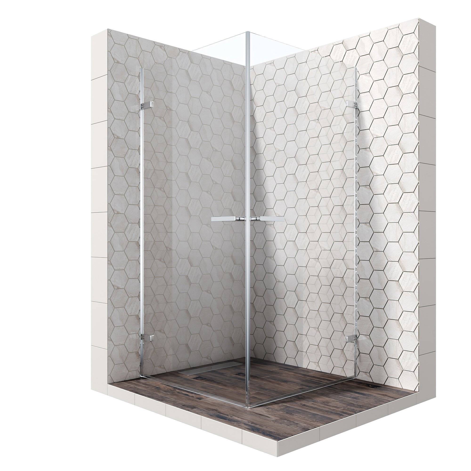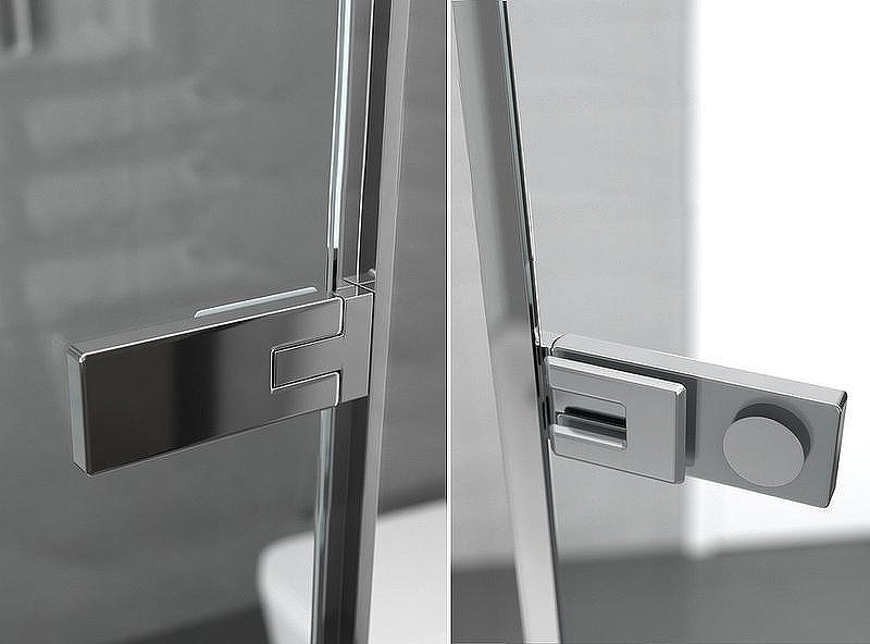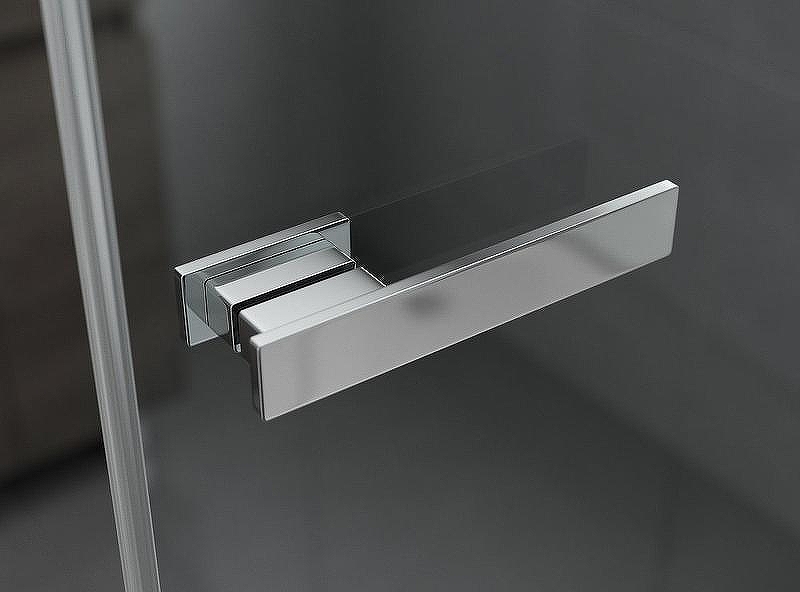 Вертикальные профили, кронштейны для стабилизации ограждений, латунные ручки, планка порога, внутренние и наружные части петель изготовлены в отделке SlimChrome+, придающей максимальную утонченность и блеск для сочетания со смесителем и душем.