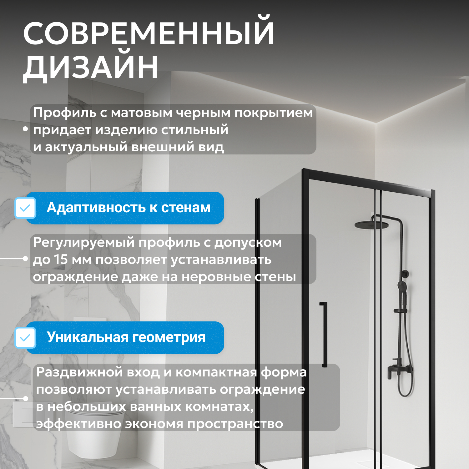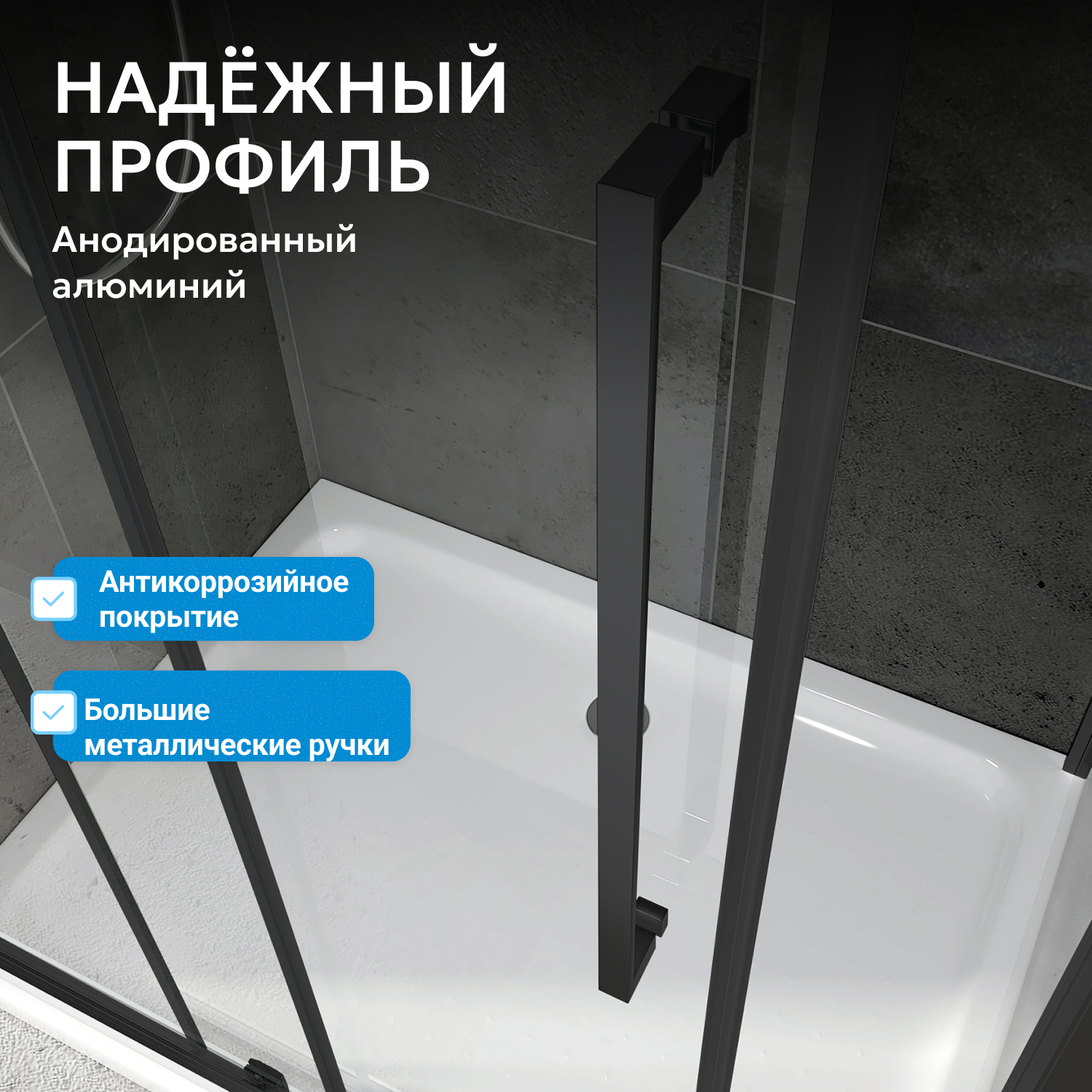 Герметичное примыкание створки предотвращает протечки, раздвижная конструкция экономит место, отсутствие доводчиков не требует дополнительных затрат на обслуживание. Классический дизайн и чёрный профиль подходят для современных интерьеров.