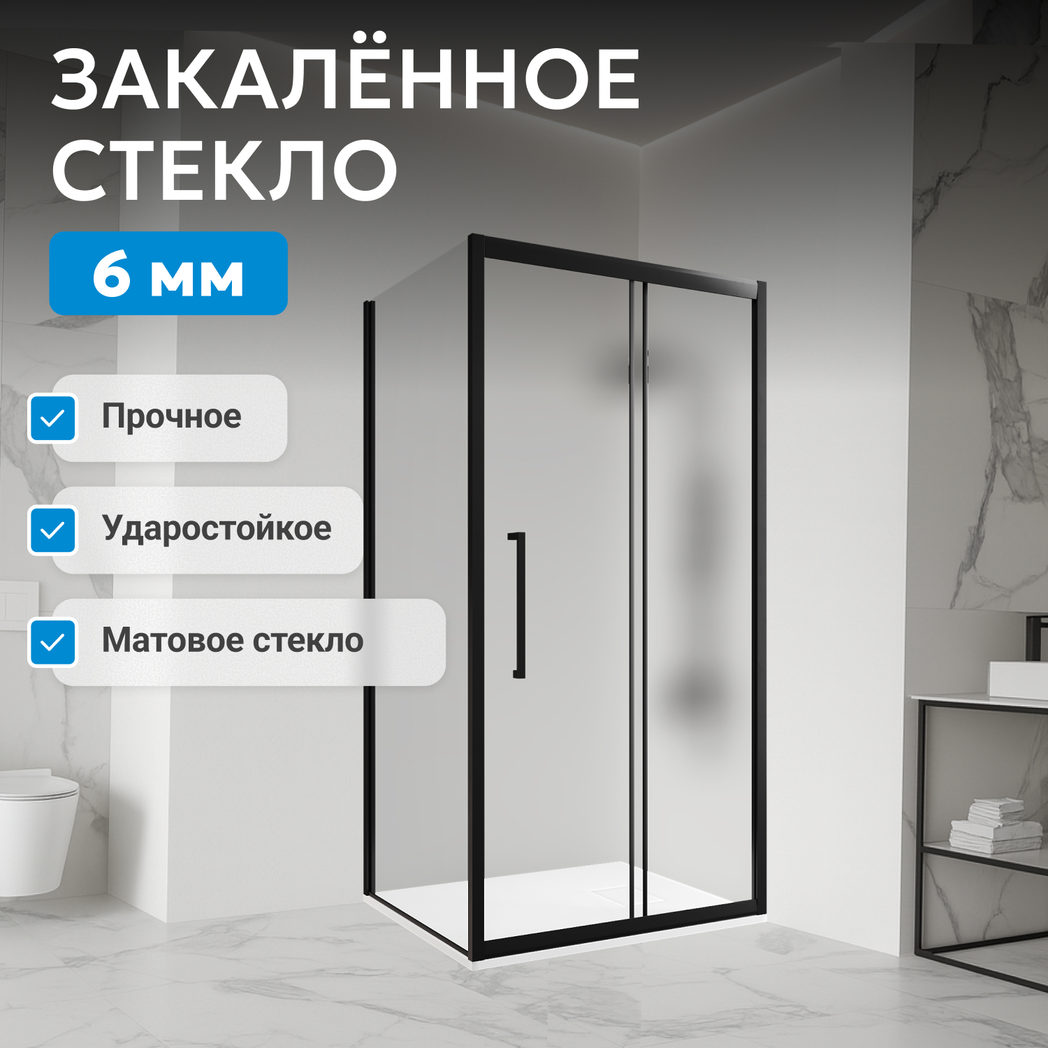 Оснащён металлическими ручками и двойными роликами для плавного, надёжного открывания двери. Прочная алюминиевая фурнитура с чёрным покрытием гармонирует с современным интерьером. Конструкция совместима с большинством низких поддонов (приобретаются отдельно), что позволяет гибко организовать душевую зону.
