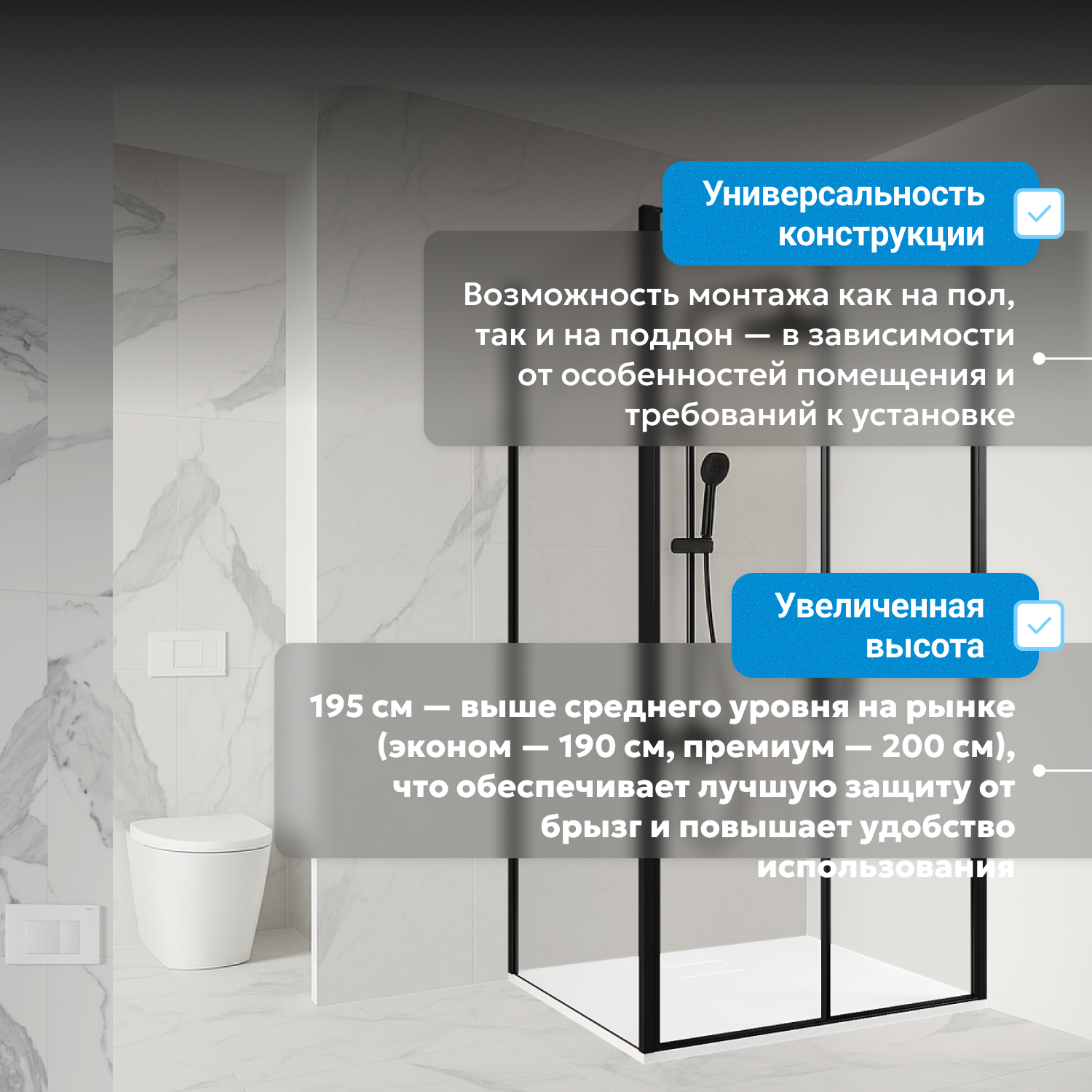 Черный профиль модели подчеркивает современный стиль и сочетается с любыми цветовыми решениями. Каленое стекло устойчиво к механическим повреждениям. Для изделия предусмотрена установка на низкий поддон, приобретаемый отдельно — это позволяет выбрать подходящую высоту и цвет поддона.