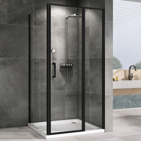 Профиль из чёрного металла дополняет прозрачное стекло толщиной 6 мм, подчеркивая минималистичный стиль. Высота 195 см обеспечивает герметичность и защиту от брызг. Прочная металлическая ручка сохраняет удобство и долговечность при ежедневном использовании. Немецкие технологии производства гарантируют стабильное качество отделки и сборки.