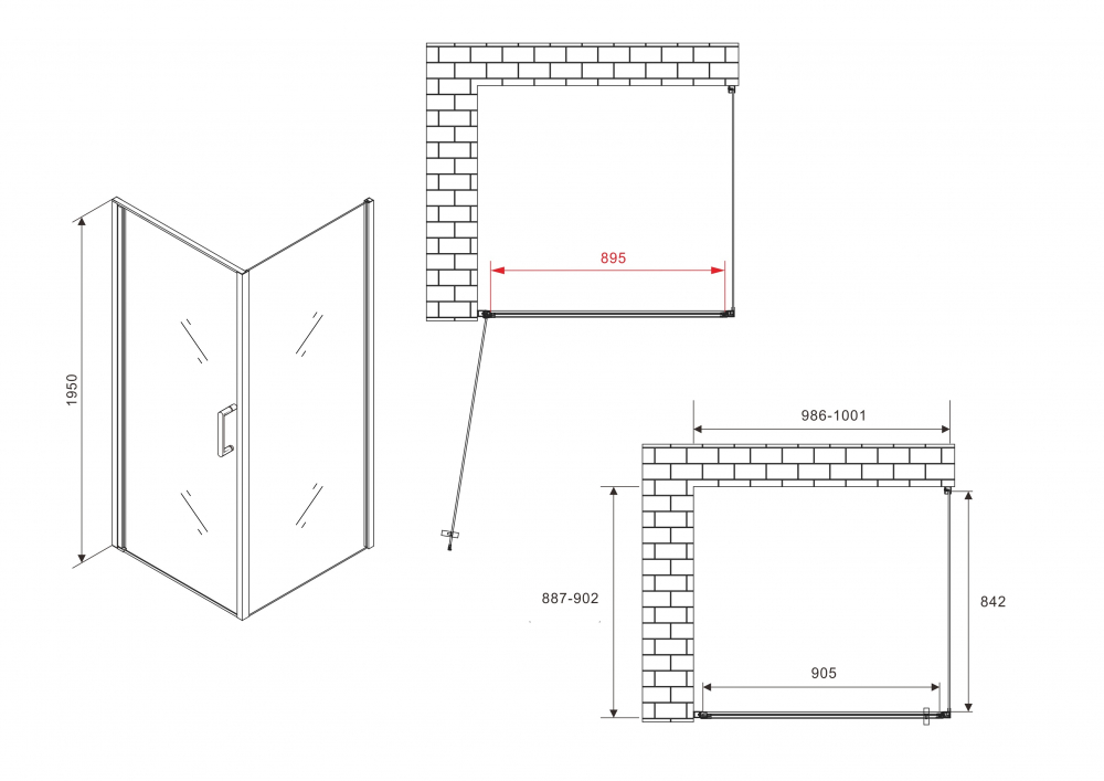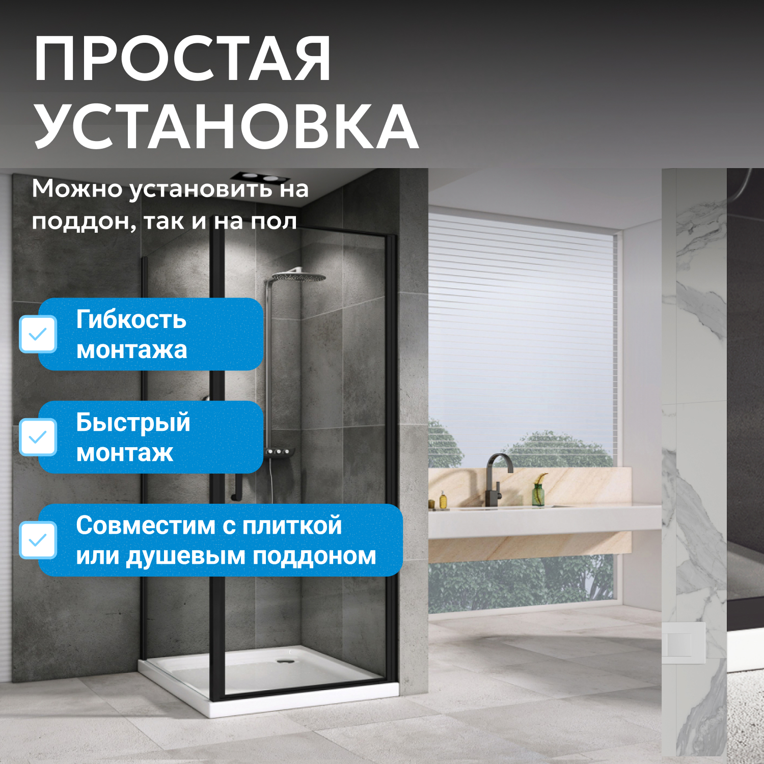 Модель сочетает немецкие технологические стандарты и российское производство. Черный профиль подходит для различных интерьеров, а прямоугольная форма и размеры 100x90 см (высота 195 см) позволяют использовать уголок в ванных комнатах разной площади. Возможна установка на пол или с низким поддоном (приобретается отдельно).