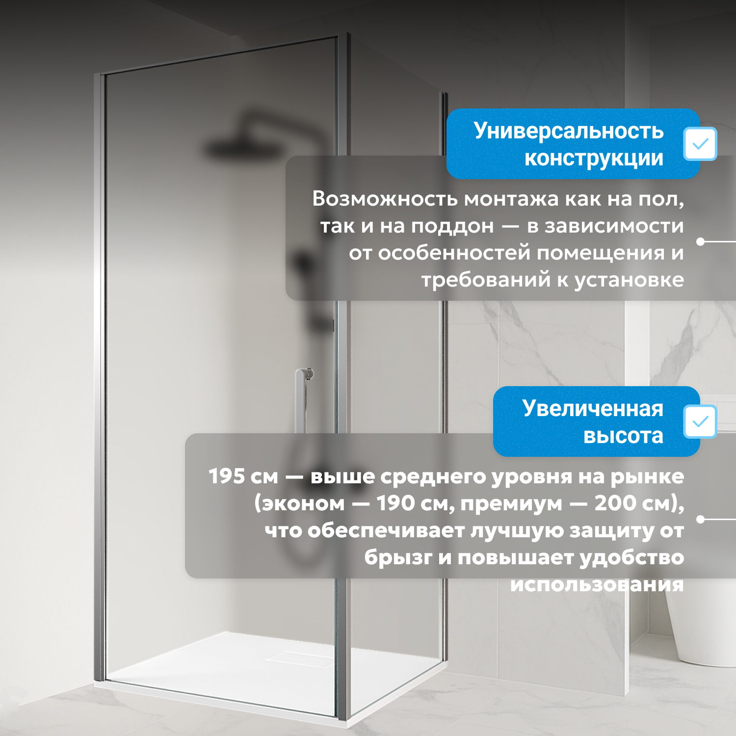 Высота конструкции 195 см, ширина входа 795 мм гарантируют удобство. Маятниковая система петель позволяет открывать двери внутрь и наружу, что удобно для малогабаритных помещений. В комплекте крепкая металлическая ручка, поддон приобретается отдельно для подбора под интерьер.