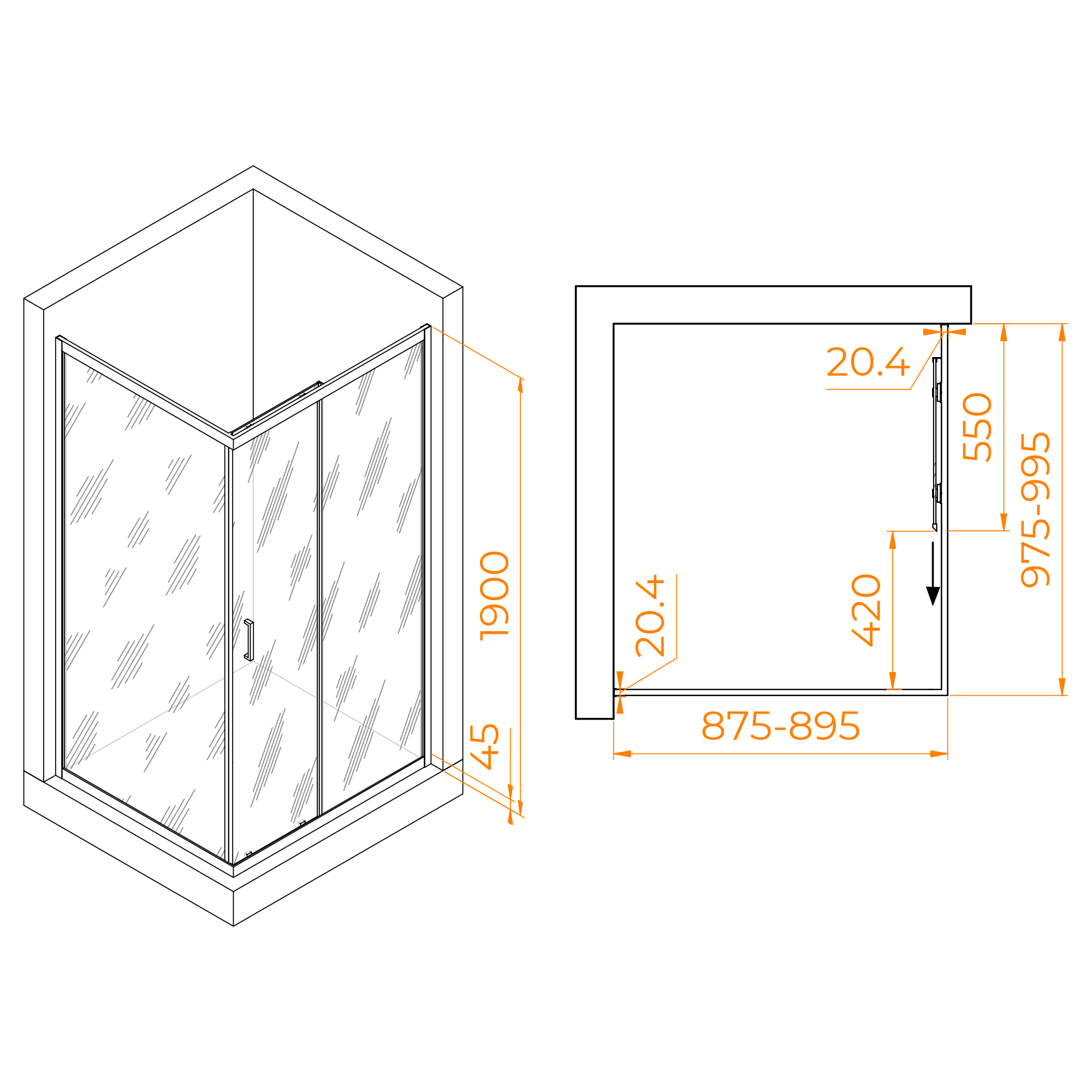 Этот душевой уголок имеет форму прямоугольного душевого угла, который идеально подходит для помещений с просторными душевыми зонами. Высота душевого угла составляет 1900 мм, что обеспечивает комфорт и удобство во время принятия душа.