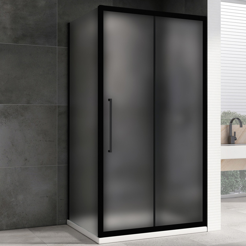 В модели используется матовое закаленное стекло толщиной 6 мм, устойчивое к повреждениям и простое в уходе. Стеклянные элементы выполнены в полупрозрачном исполнении для комфортной приватности. Черный металлический профиль органично вписывается в современные и классические интерьеры.