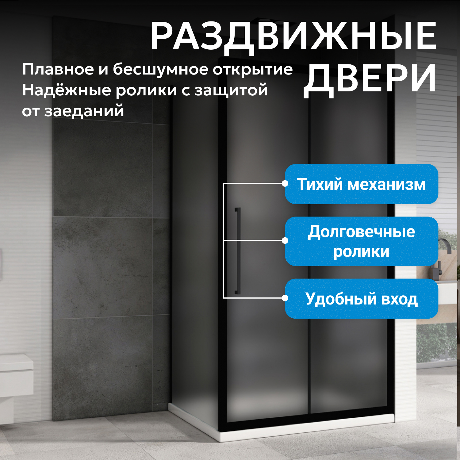 Модель из коллекции Schwarzer Diamant выполнена в современном стиле с черным профилем. Раздвижная дверь оснащена двойными роликами для плавного и бесшумного хода, металлическая ручка устойчива к износу. Поддон не входит в комплект — возможно подобрать отдельно подходящую низкую модель для единого стилевого решения.