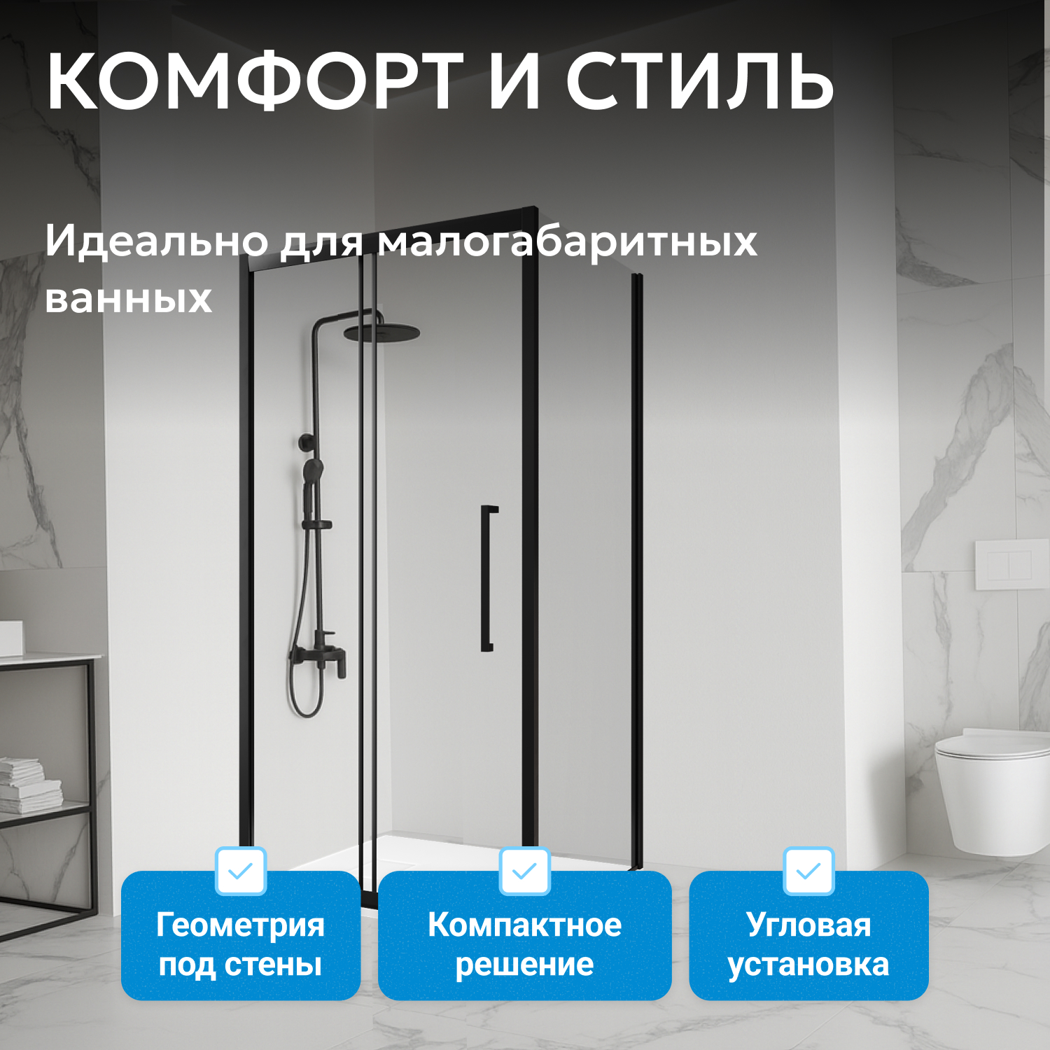 Высота конструкции 195 см, ширина 90 см, длина 120 см — компактные размеры подходят для большинства типовых санузлов и частных домов. Монтаж выполняется в угол, конструкция совместима с низким поддоном (приобретается отдельно).