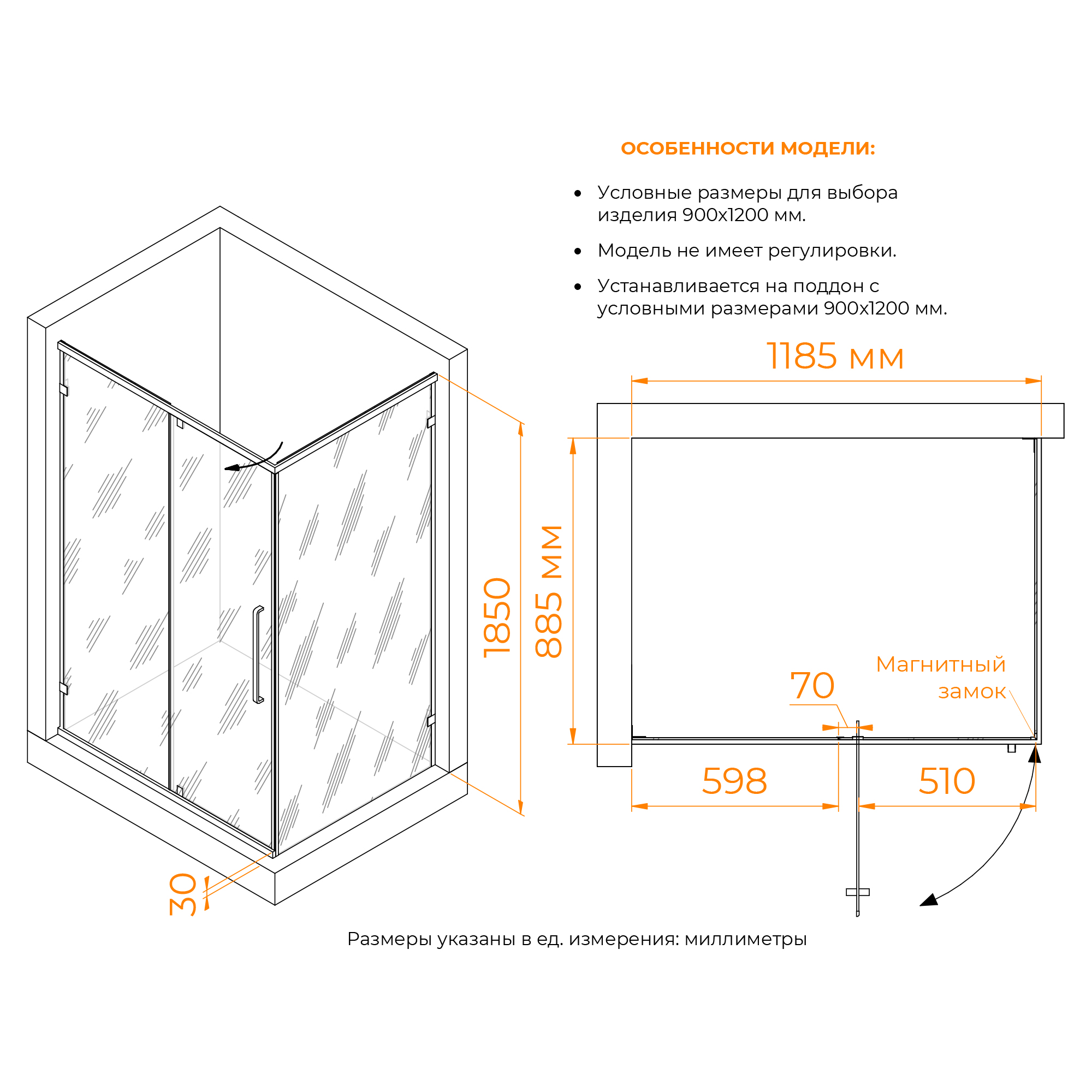 Модель представлена в чёрном исполнении профиля и фурнитуры, также обратите внимания, все уплотнители выполнены так же в чёрном цвете, что подчёркивает сдержанную стилистику душевых углов.