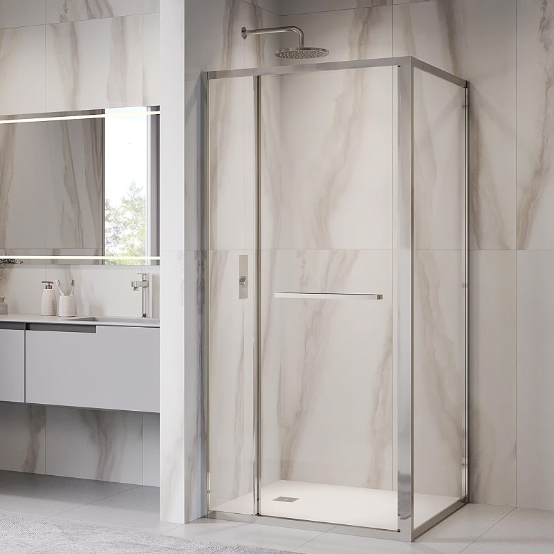 Двухсторонняя ручка из нержавеющей стали завершает облик душевого угла, добавляя практичности и стиля. При этом она может быть функционально использована как штанга для полотенца.