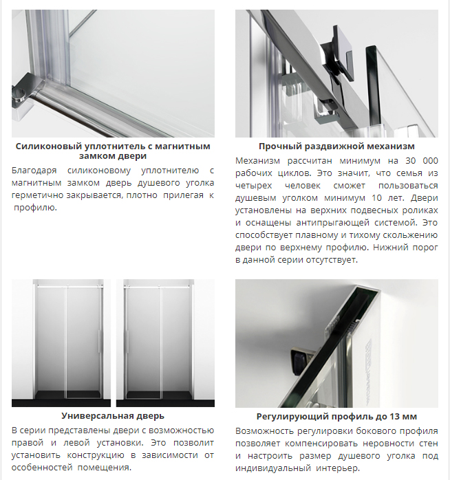 Благодаря магнитному уплотнителю двери душевого уголка герметично закрываются, плотно прилегая друг к другу.