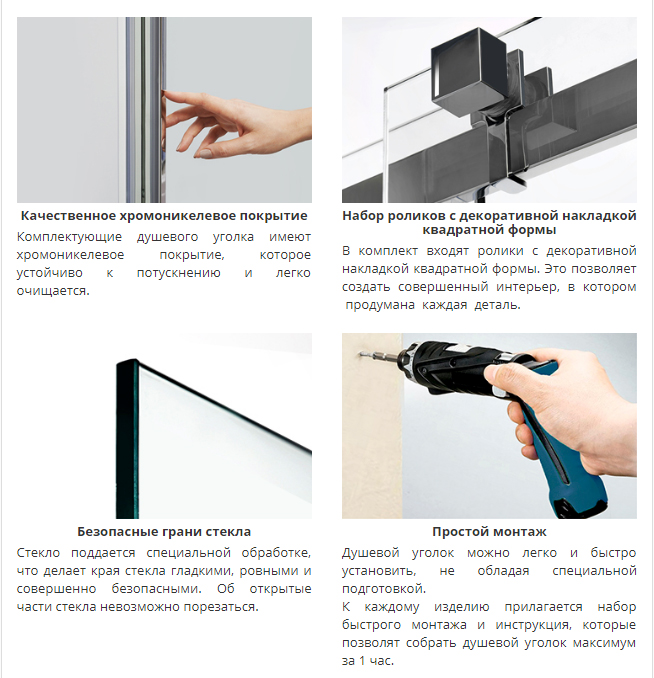 Комплектующие душевого уголка имеют хромоникелевое покрытие, которое устойчиво к потускнению и легко очищается.