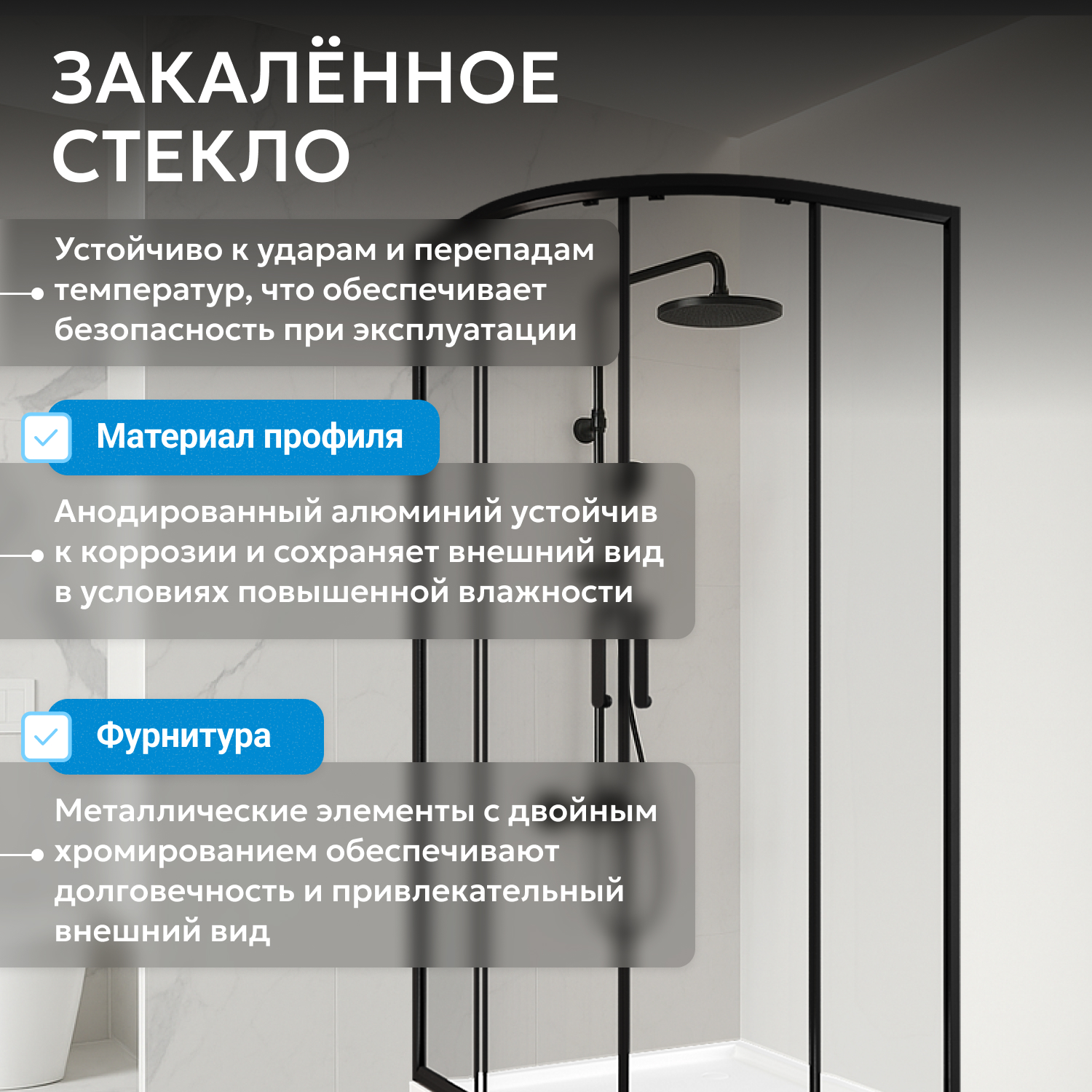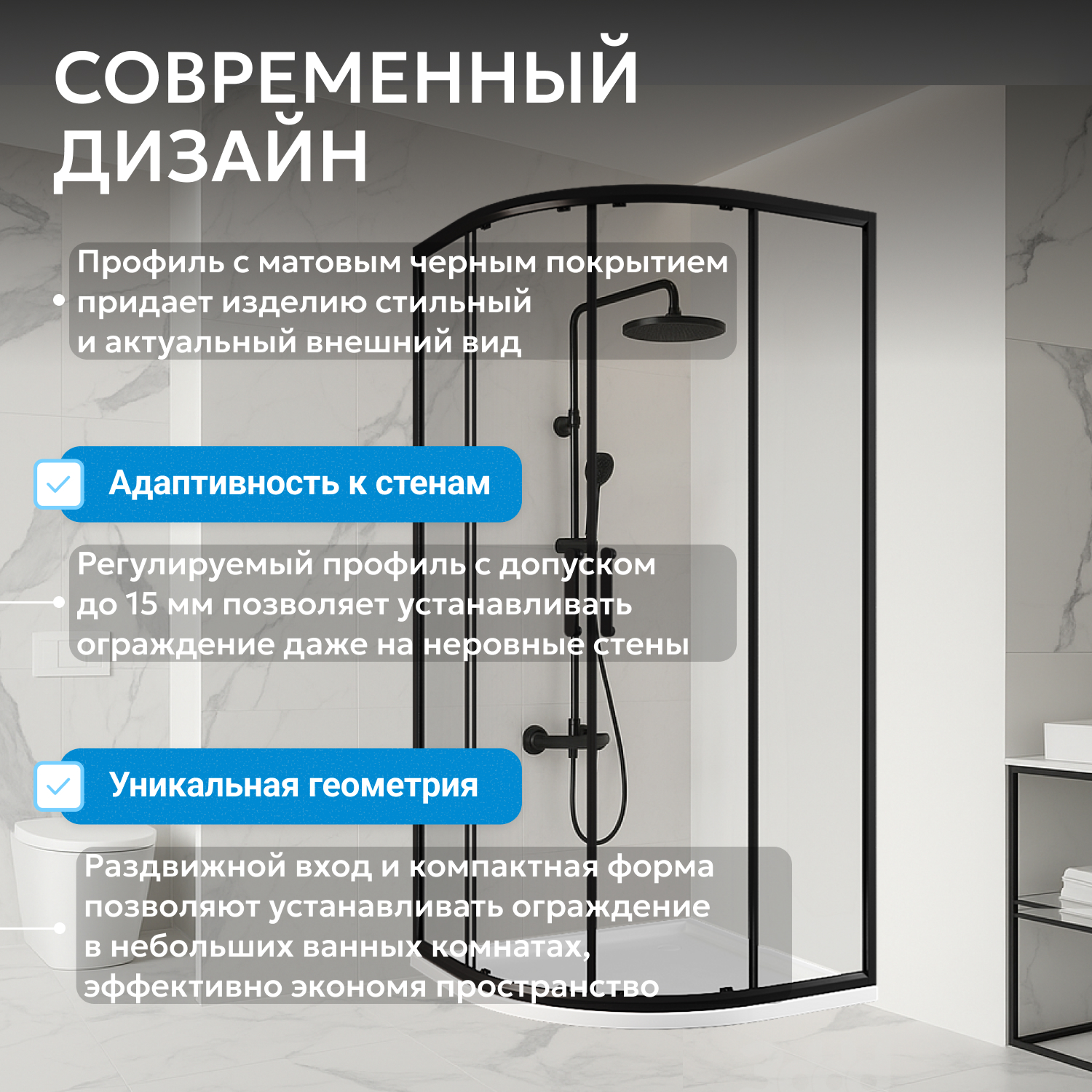 Конструкция состоит из двух раздвижных дверей с металлическими ручками для удобного использования и ухода. Ширина входа 464 мм обеспечивает комфортный проход. Поддон не входит в комплект, его можно подобрать индивидуально; модель совместима с низкими поддонами, что визуально облегчает конструкцию.