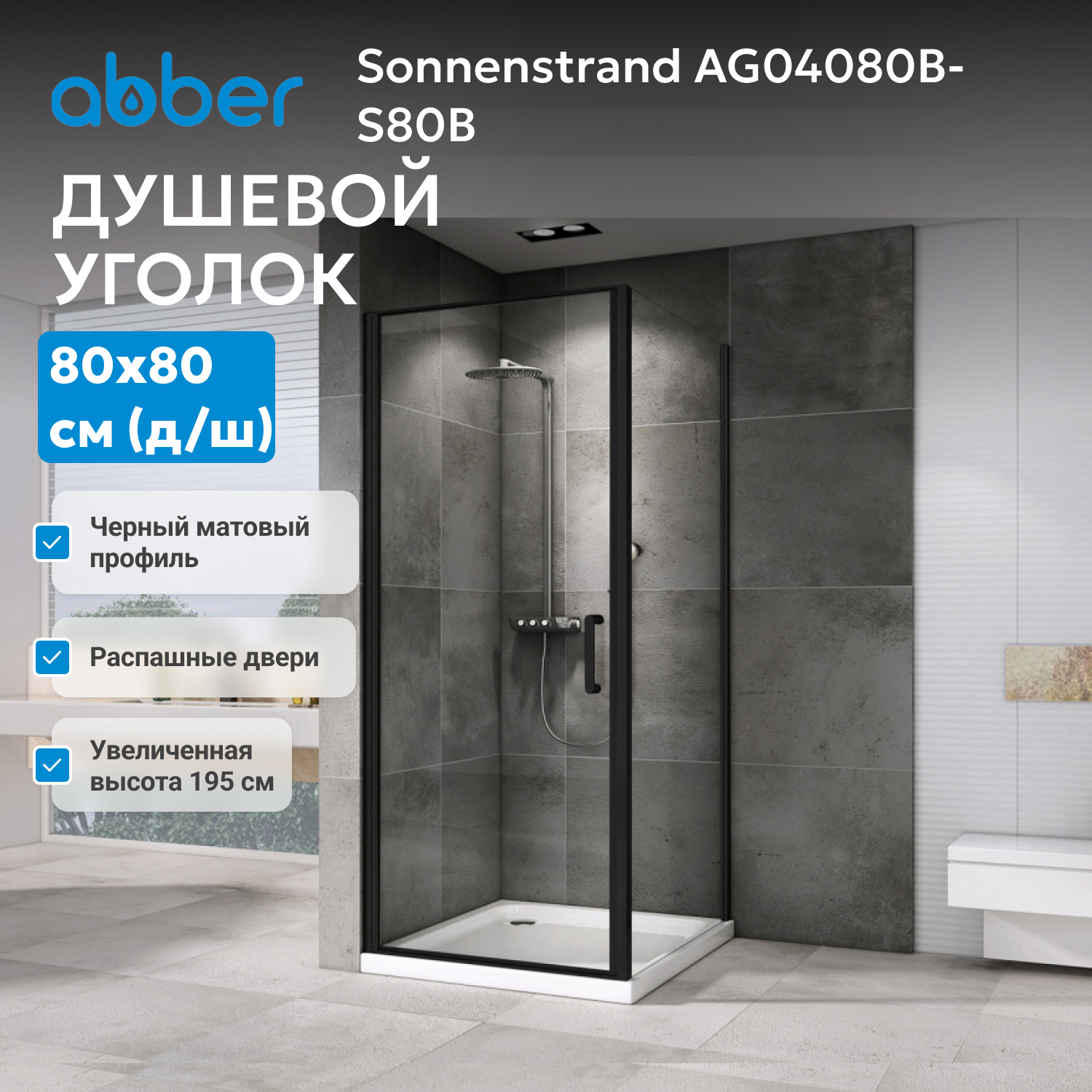 Душевой уголок Abber Sonnenstrand 80х80х195 см черный/прозрачное AG04080B-S80B