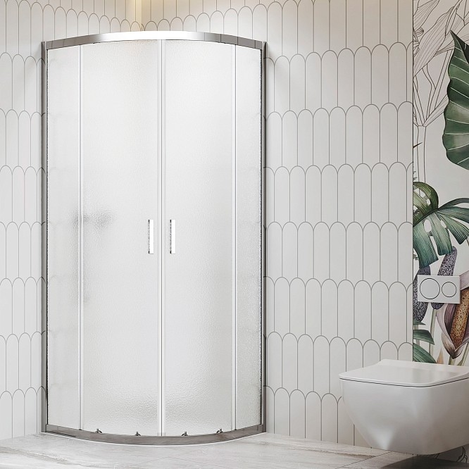 Модели представлены в полукруглой форме, что делает их универсальным решением для различных планировок ванных комнат. Текстурное стекло Cora создаёт эффект размытия силуэта, придавая интерьеру ванной комнаты уникальность и изысканность. Вариации цветовых решений профиля: хром, чёрный.