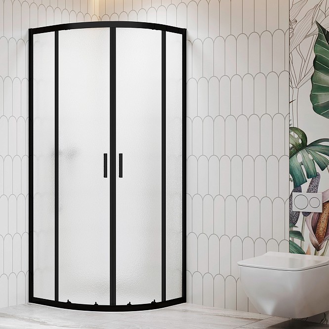 Модели представлены в полукруглой форме, что делает их универсальным решением для различных планировок ванных комнат. Текстурное стекло Cora создаёт эффект размытия силуэта, придавая интерьеру ванной комнаты уникальность и изысканность. Вариации цветовых решений профиля: хром, чёрный.
