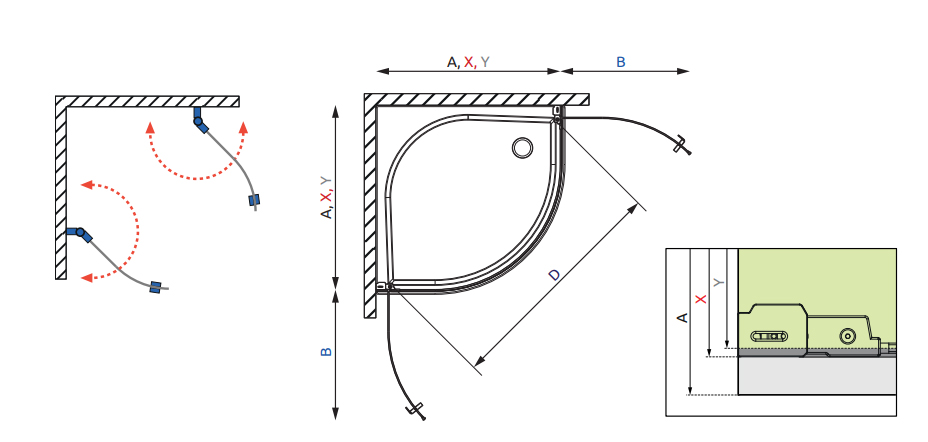 Для установки требуются две душевые двери (левая и правая). Тем самым конструкция превращается в душевой уголок. Установка дверей отдельно не предусмотрена!