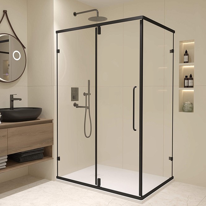 Модель представлена в чёрном исполнении профиля и фурнитуры, также обратите внимания, все уплотнители выполнены так же в чёрном цвете, что подчёркивает сдержанную стилистику душевых углов.