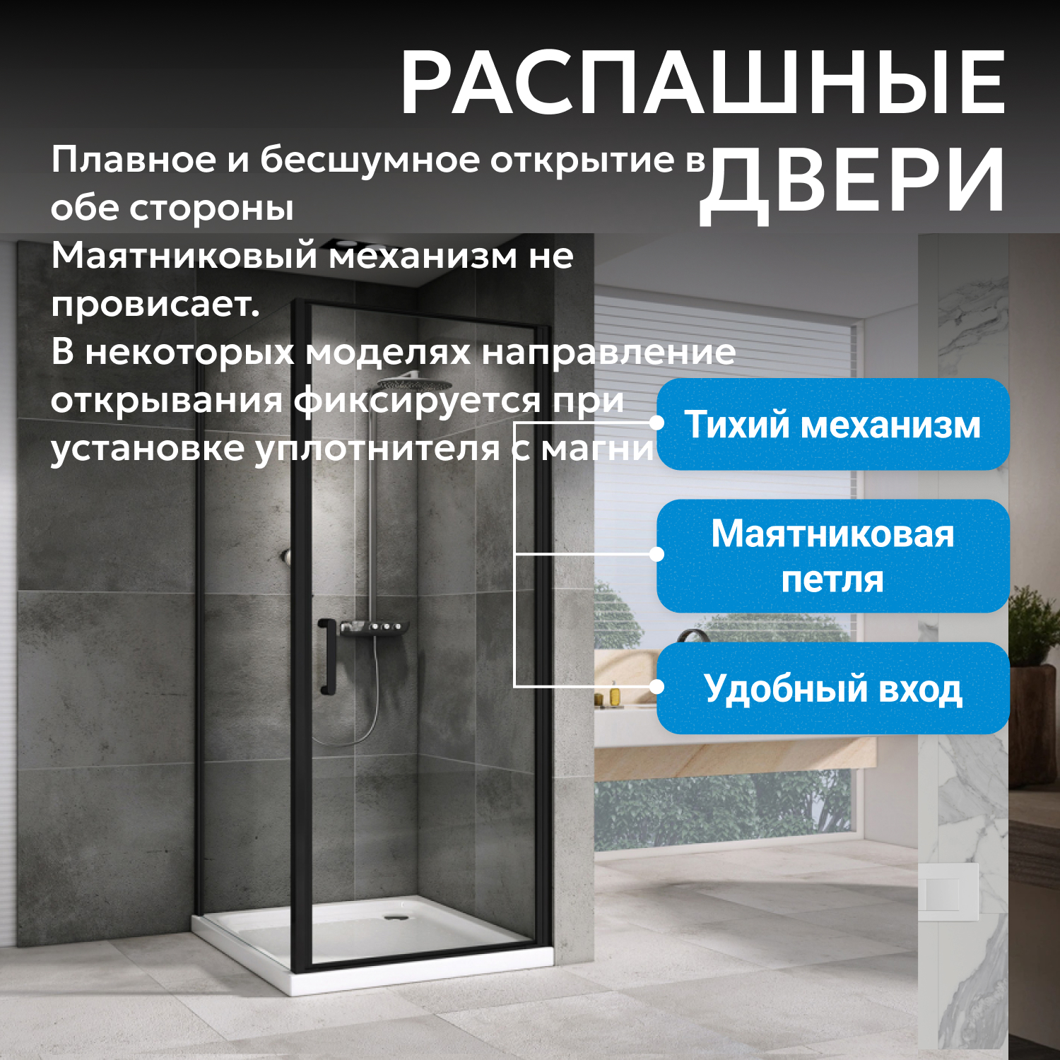 Распашная дверь на маятниковой петле открывается внутрь и наружу, оснащена металлической ручкой для удобства и надежности. Монтаж проводится в угол помещения, низкий поддон приобретается отдельно, что дает возможность подобрать вариант установки под требования ремонта.