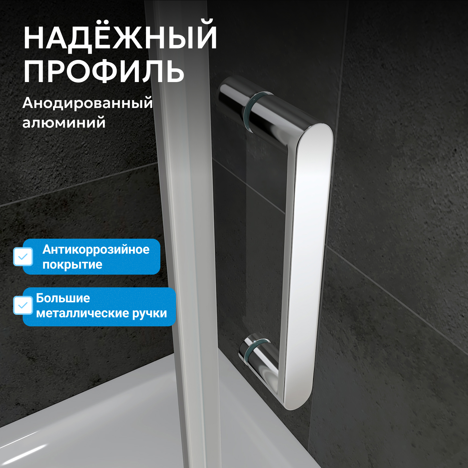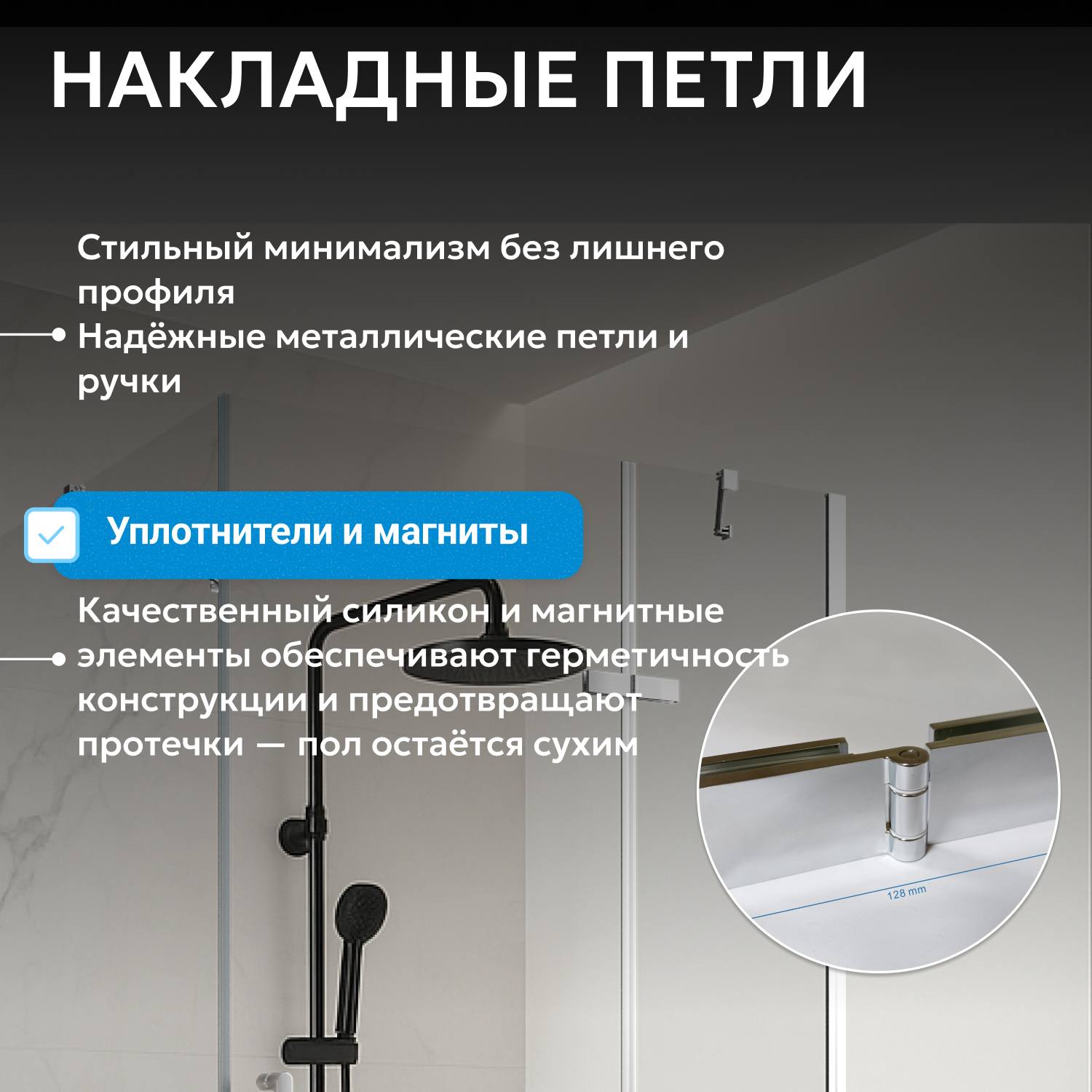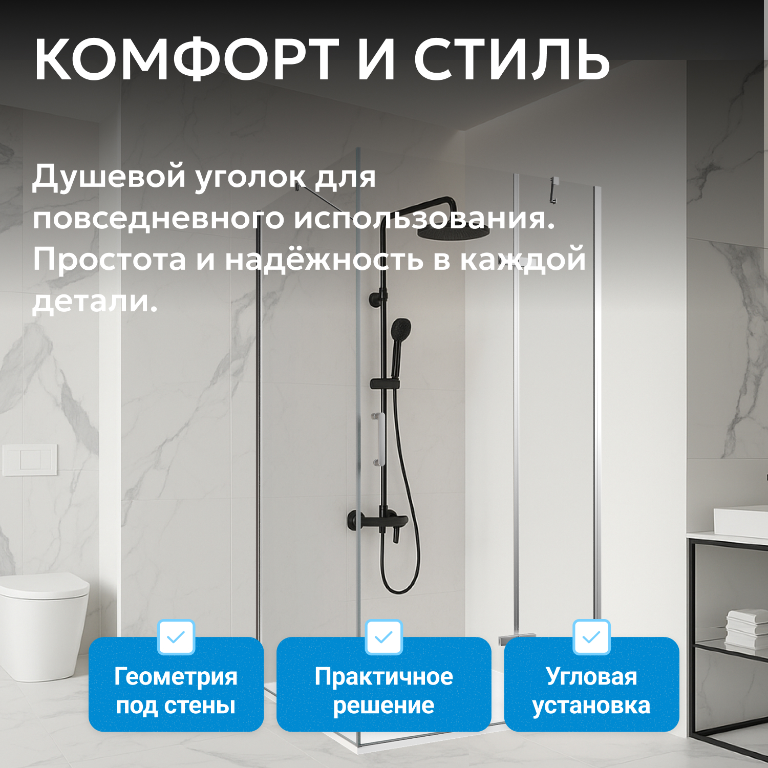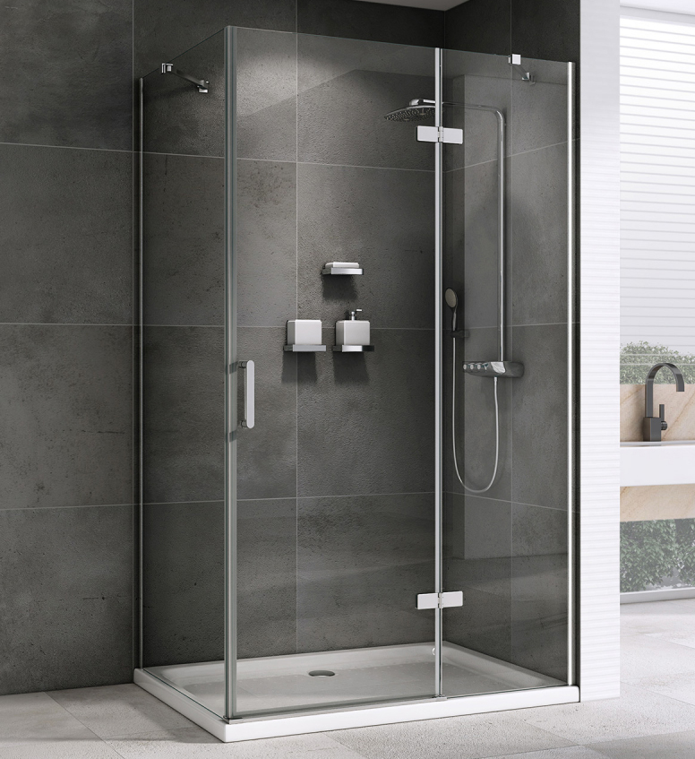Распашная дверь с широким входом (570 мм) обеспечивает удобство и свободный доступ. Монтаж производится в угол помещения, что экономит место. Возможна установка с поддоном, который подбирается отдельно по желанию покупателя.