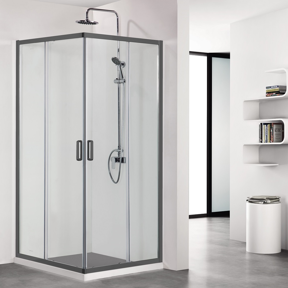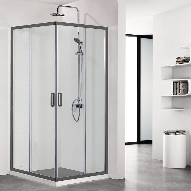 Раздвижные двери экономят место в ванной, при открывании вода остается в душевого зоне и не попадает на пол.