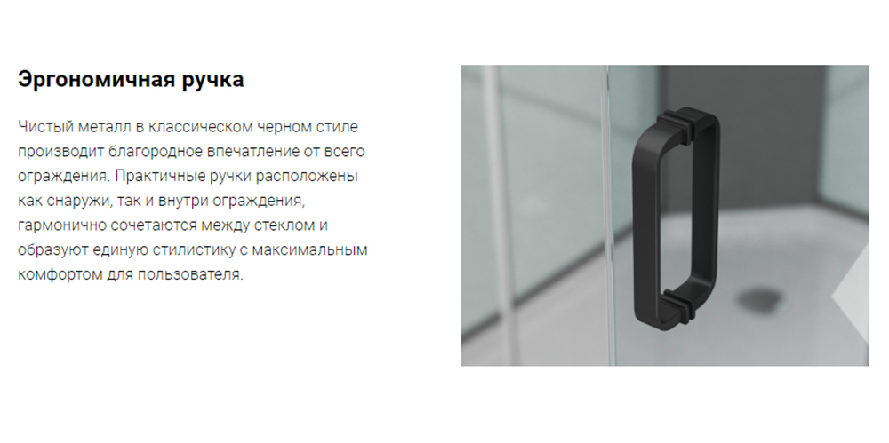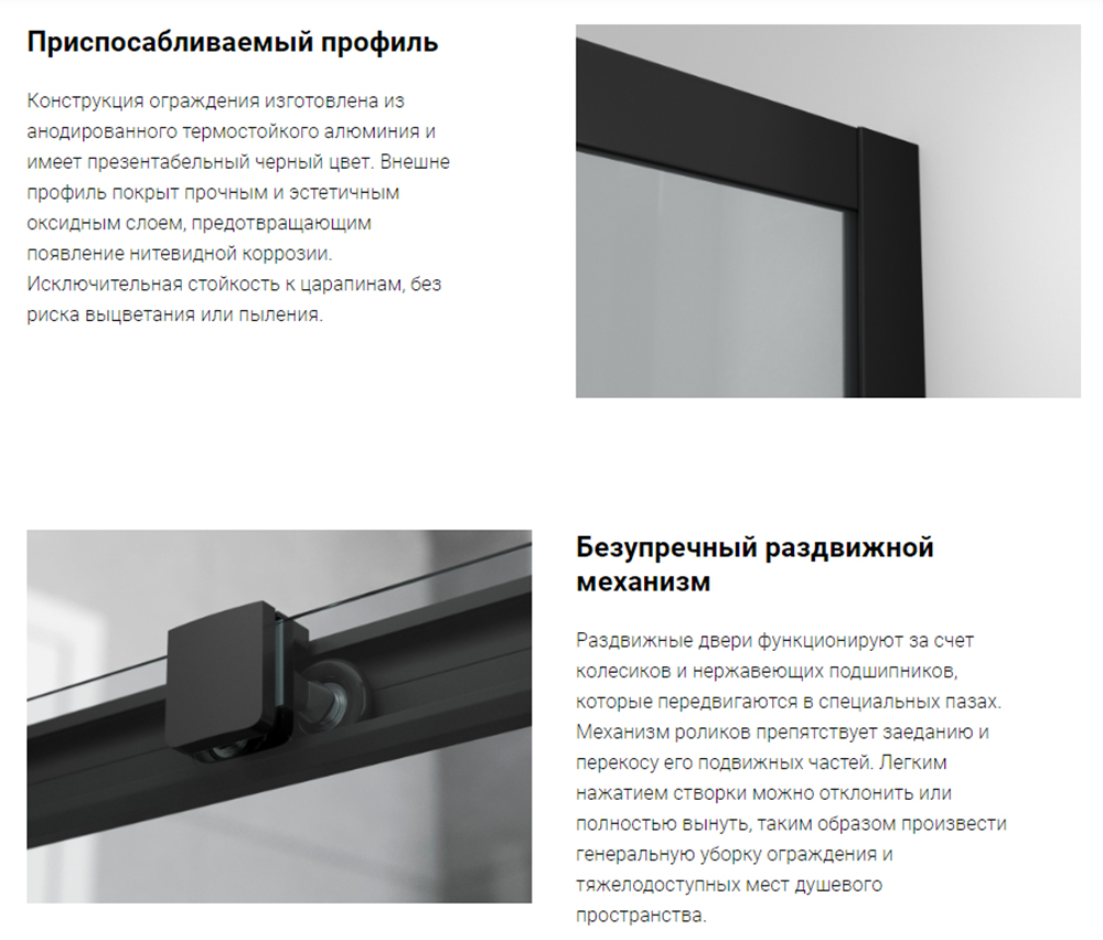 Уплотнители обеспечивают 100% герметичность изделия, благодаря плотному соединению стекольного полотна со всеми элементами душевого ограждения.