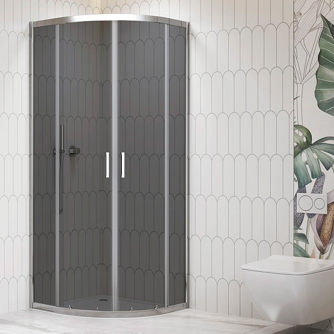 Модели представлены в полукруглой форме, что делает их универсальным решением для различных планировок ванных комнат. Текстурное стекло Cora создаёт эффект размытия силуэта, придавая интерьеру ванной комнаты уникальность и изысканность. Вариации цветовых решений профиля: хром, чёрный.