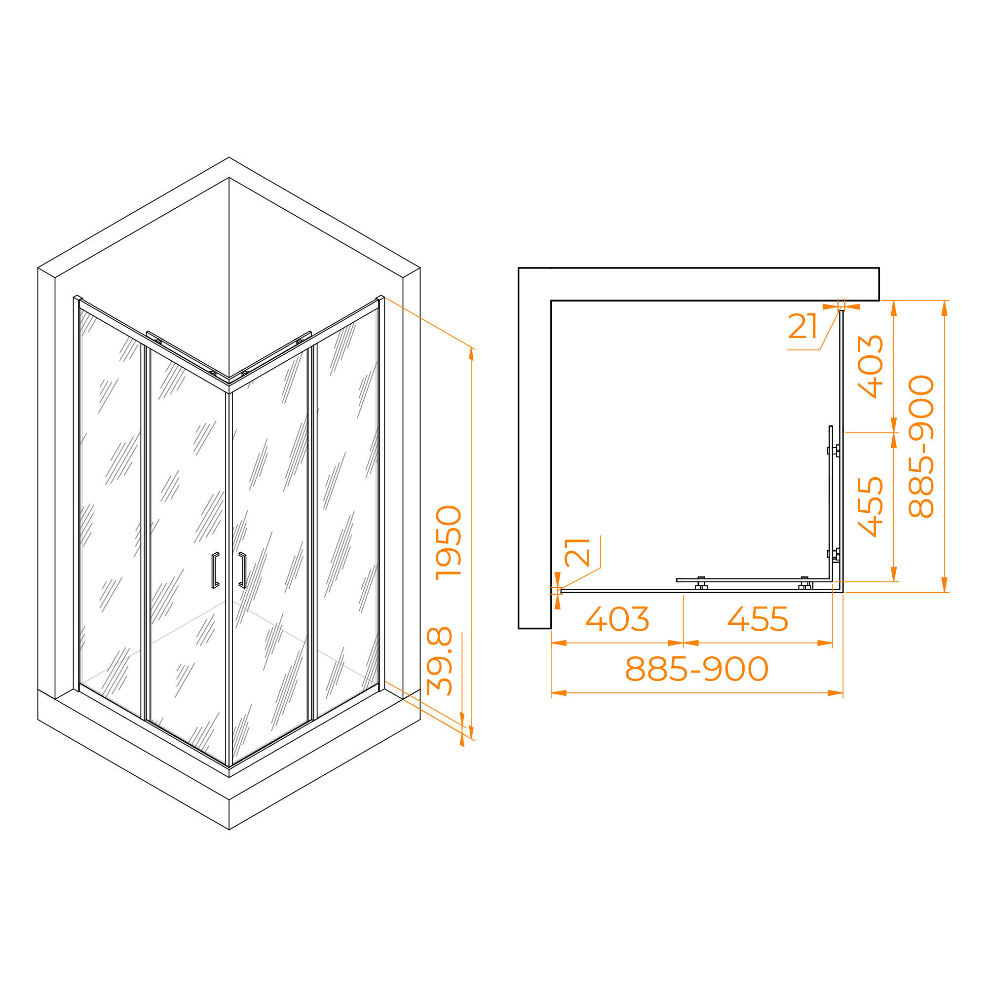 Высота душевого уголка составляет 1950 мм, что позволяет использовать его даже для людей высокого роста. Стойки и рама изготовлены из анодированного алюминия, для предотвращения коррозии и сохранения привлекательного внешнего вида на долгие годы.