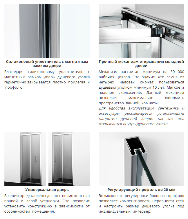 Благодаря магнитному уплотнителю двери душевого уголка герметично закрываются, плотно прилегая друг к другу.