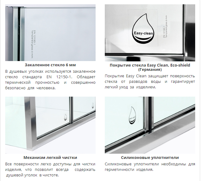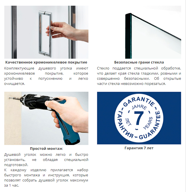 Комплектующие душевого уголка имеют хромоникелевое покрытие, которое устойчиво к потускнению и легко очищается.