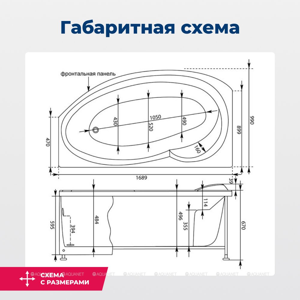 Акриловая асимметричная ванна Aquanet Jersey 170x90 см L/R с каркасом 205405/ 205329