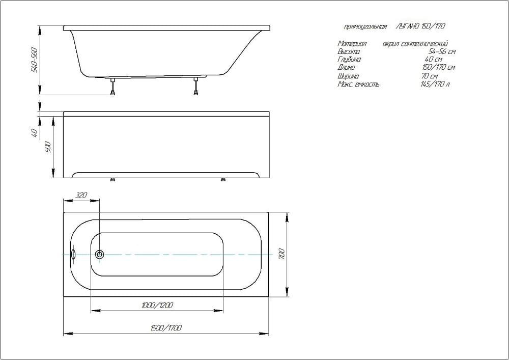 Акриловая прямоугольная ванна Акватек Lifestyle Лугано 170x70 см LUG170-0000001