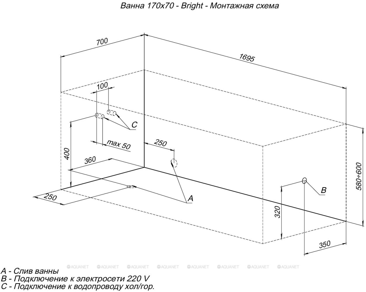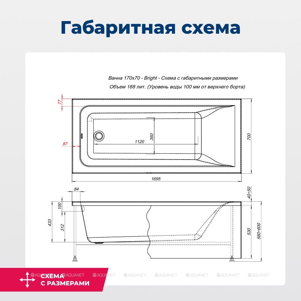 Акриловая прямоугольная ванна Aquanet Bright 170x70 см, с каркасом 267835