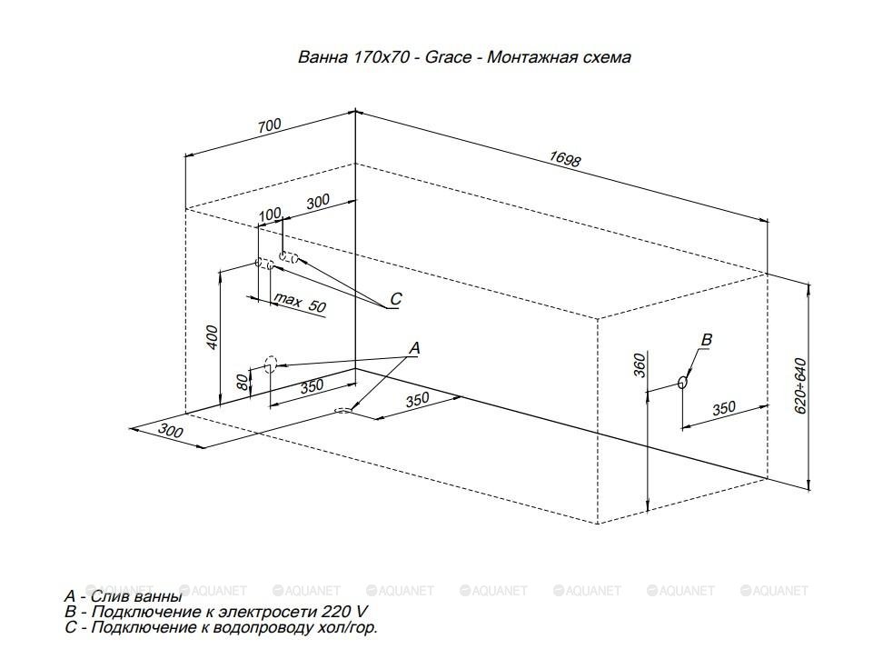 Акриловая прямоугольная ванна Aquanet Grace 170x70 см, с каркасом 312653