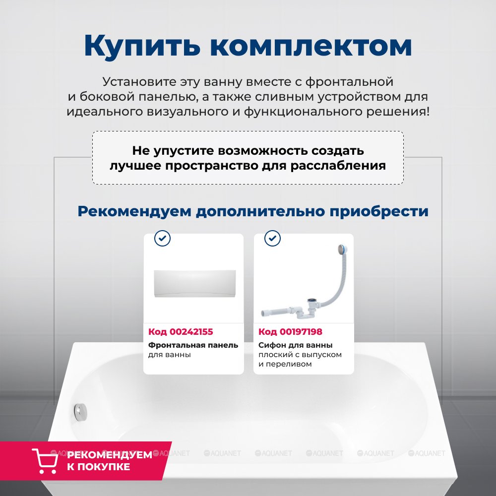 Дополнительно необходимо выбрать фронтальную и/или боковую панель и слив-перелив с сифоном. Рекомендуем к покупке автоматические сливы-переливы "Click-Clack".