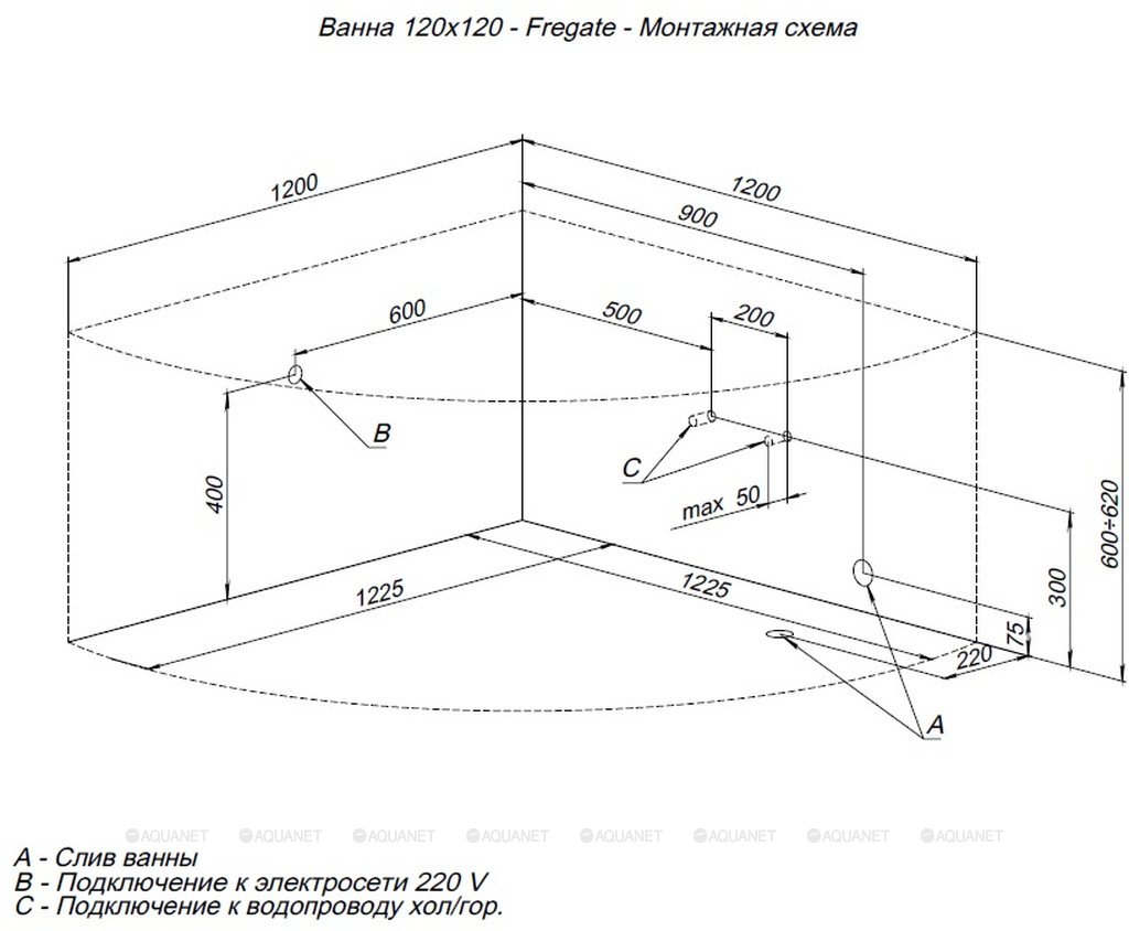 Акриловая угловая ванна Aquanet Fregate 120x120 см, с каркасом 205488