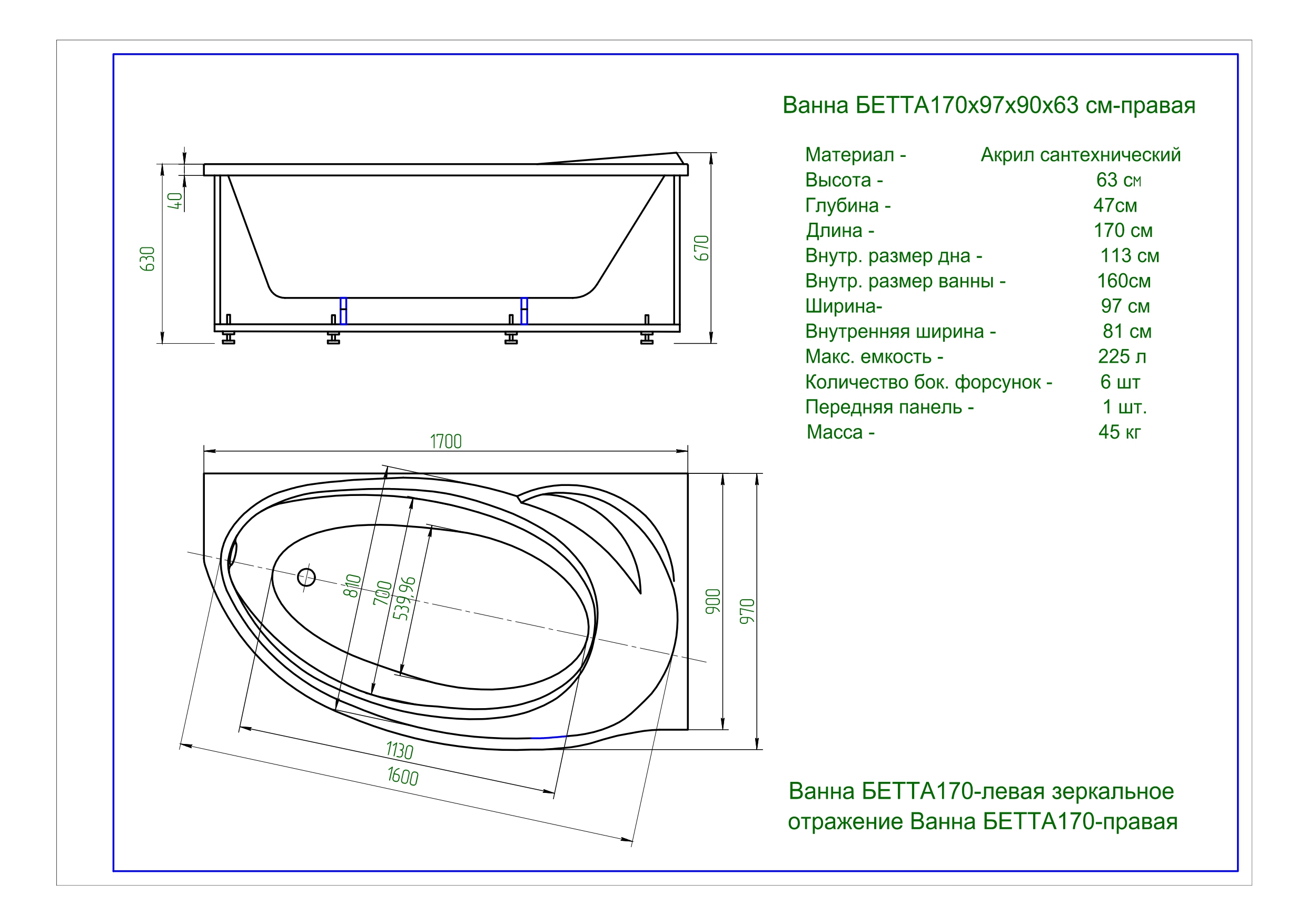 | Оснащение | Ванна, каркас, слив-перелив, фронтальный экран |