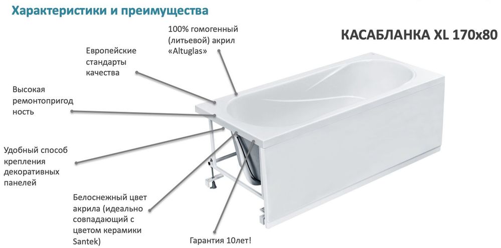 Акриловая ванна Santek Касабланка XL 170х80 см 1.WH30.2.441