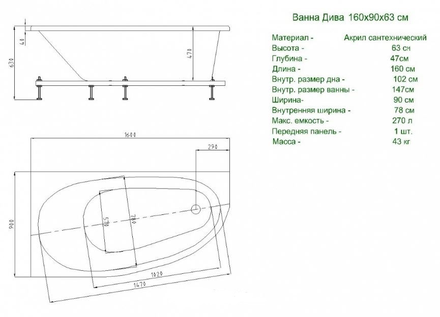 Асимметричная акриловая ванна Акватек Дива 160x90 см L/R DIV160-0000001/ DIV160-0000002