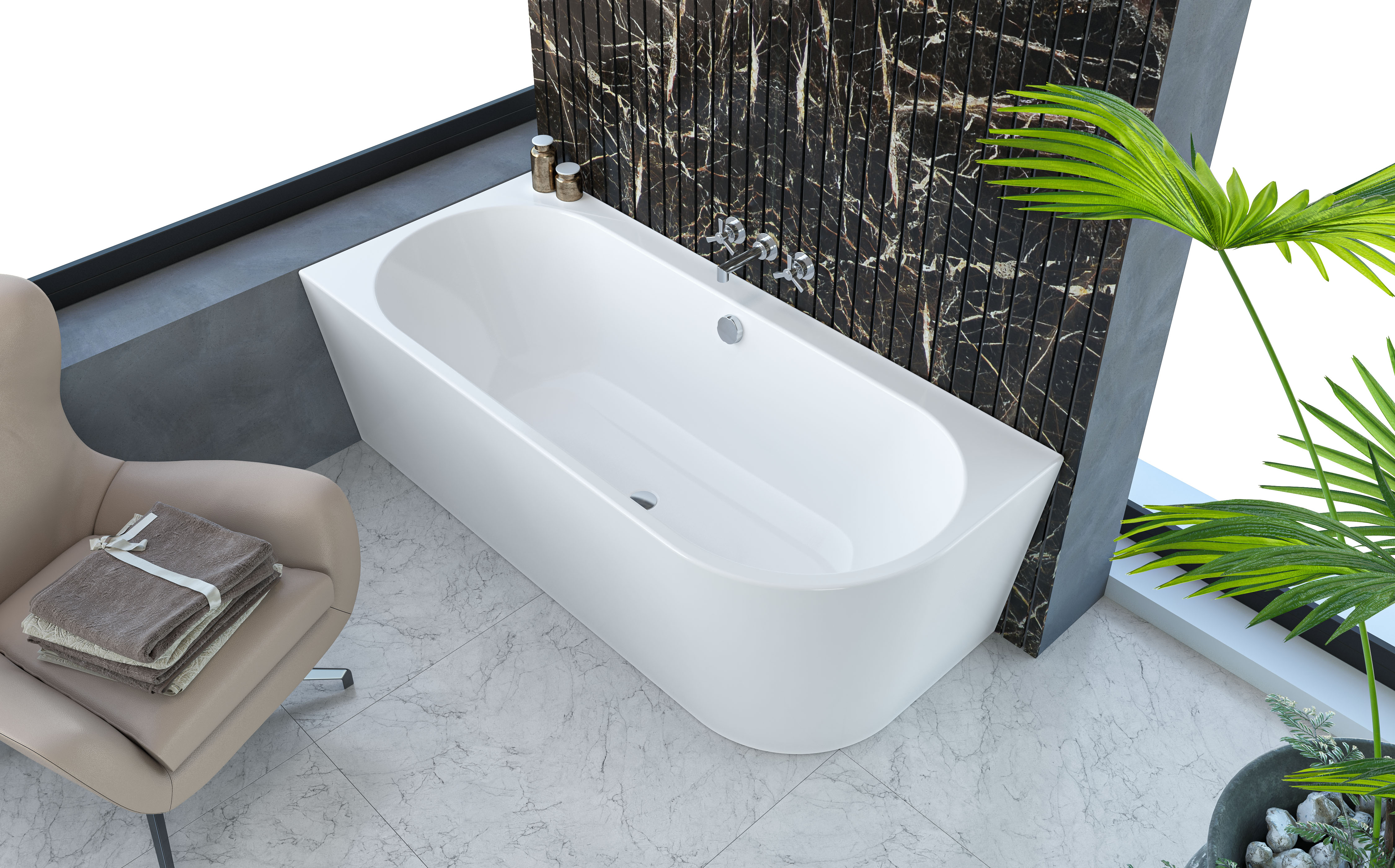 Собранная ванна на каркасе со сливом-переливом,