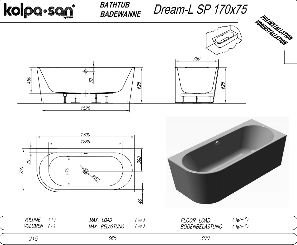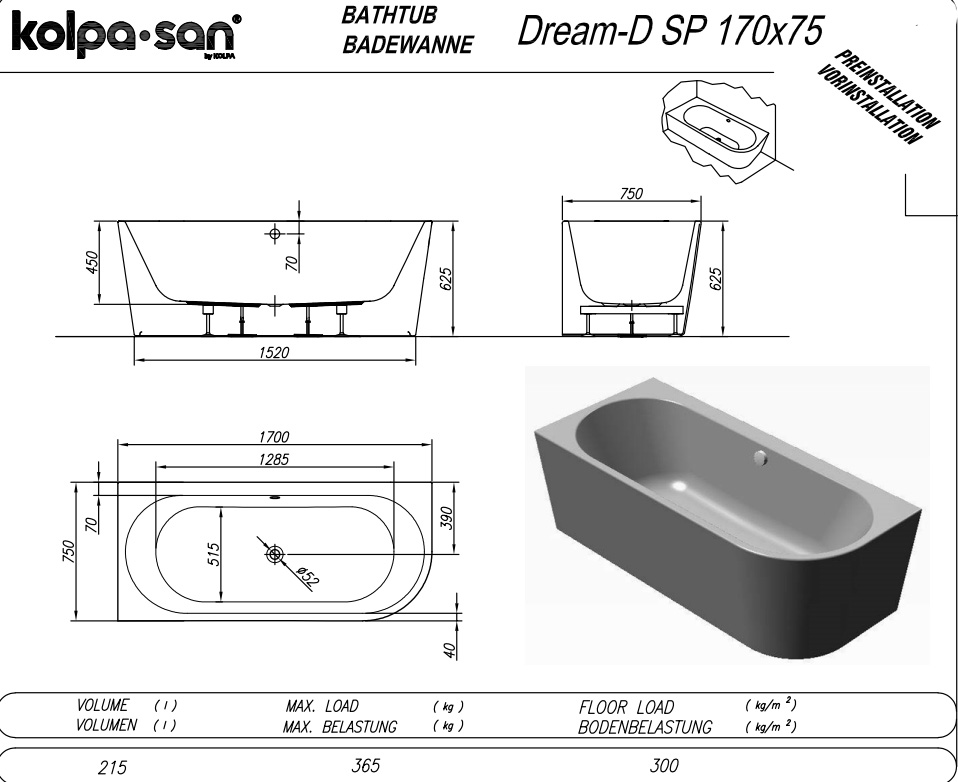 Асимметричная акриловая ванна Kolpa-san Dream SP 170х75 см L/R, с каркасом, сливом-переливом