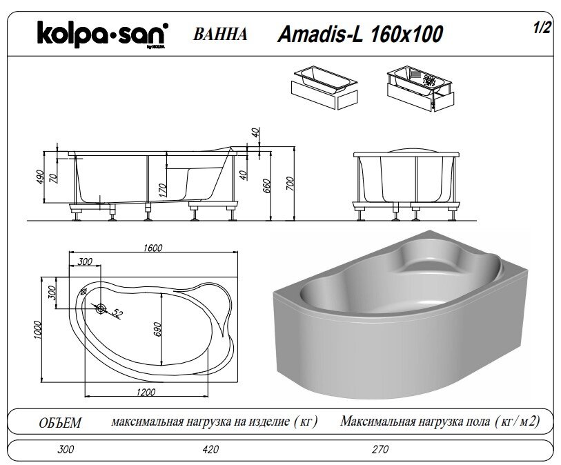 Асимметричная акриловая ванна Kolpa-san QUAT Amadis 160х100 см L/R
