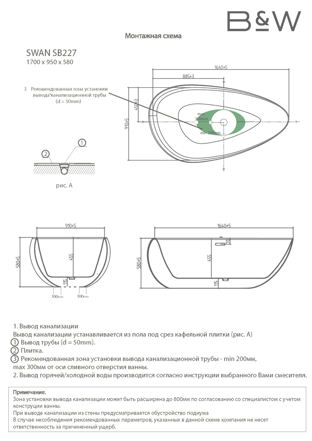 Отдельностоящая акриловая ванна Black & White Swan SB227 170х95 см 227SB00